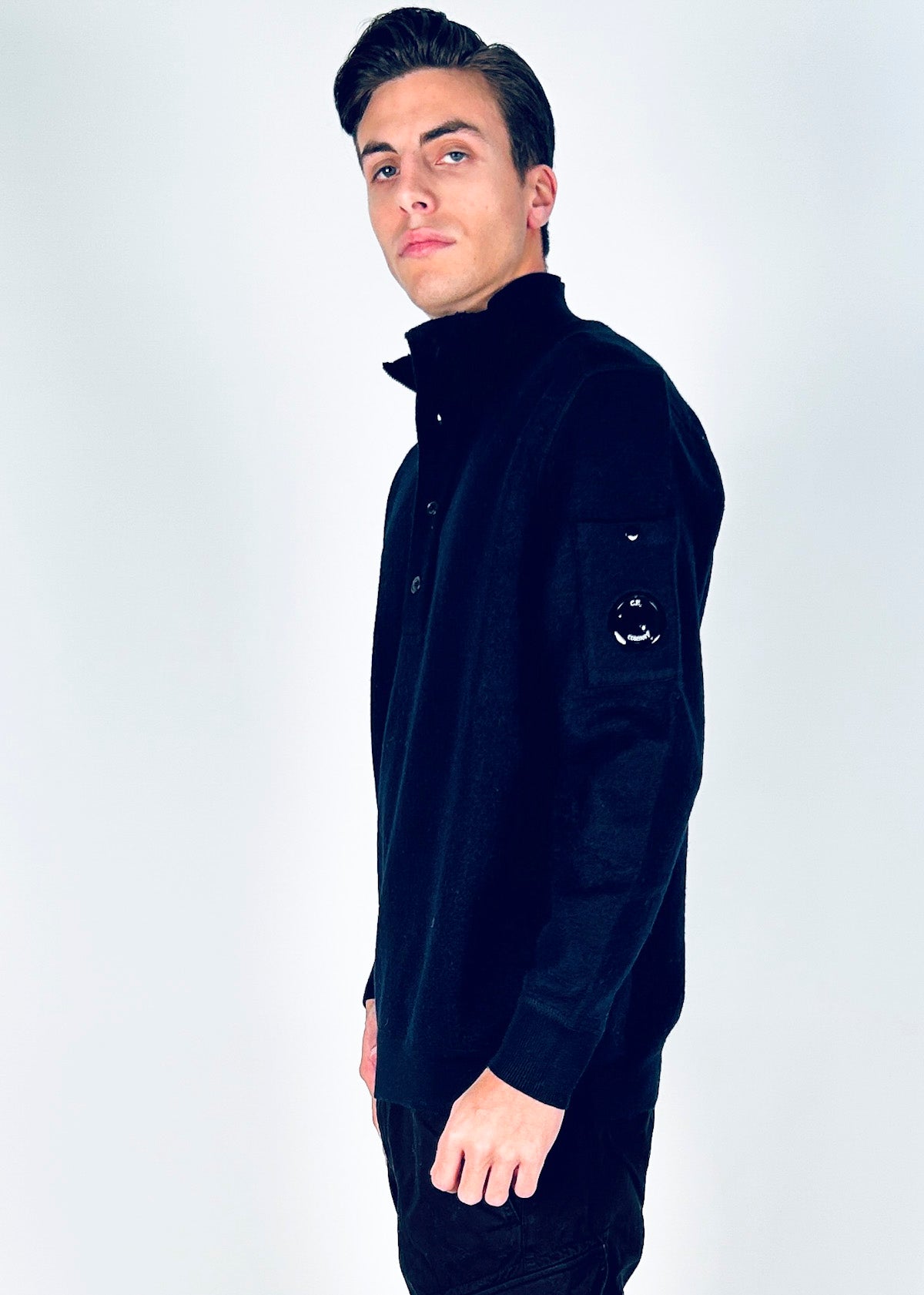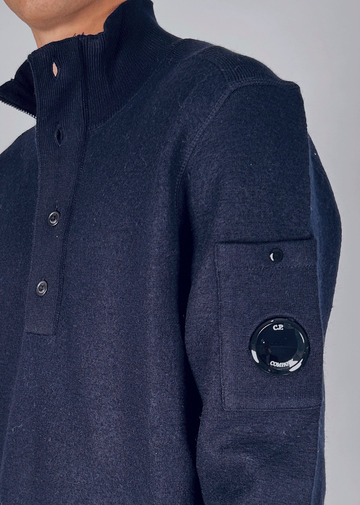 Maglione in lana merino infeltrita con mezza abbottonatura, collo e polsini a costine, taschino con Lente e vestibilità regular. Finezza 12. Disponibile dalla S alla XL. Il modello è alto 1.86m ed indossa la taglia M. Made in India.