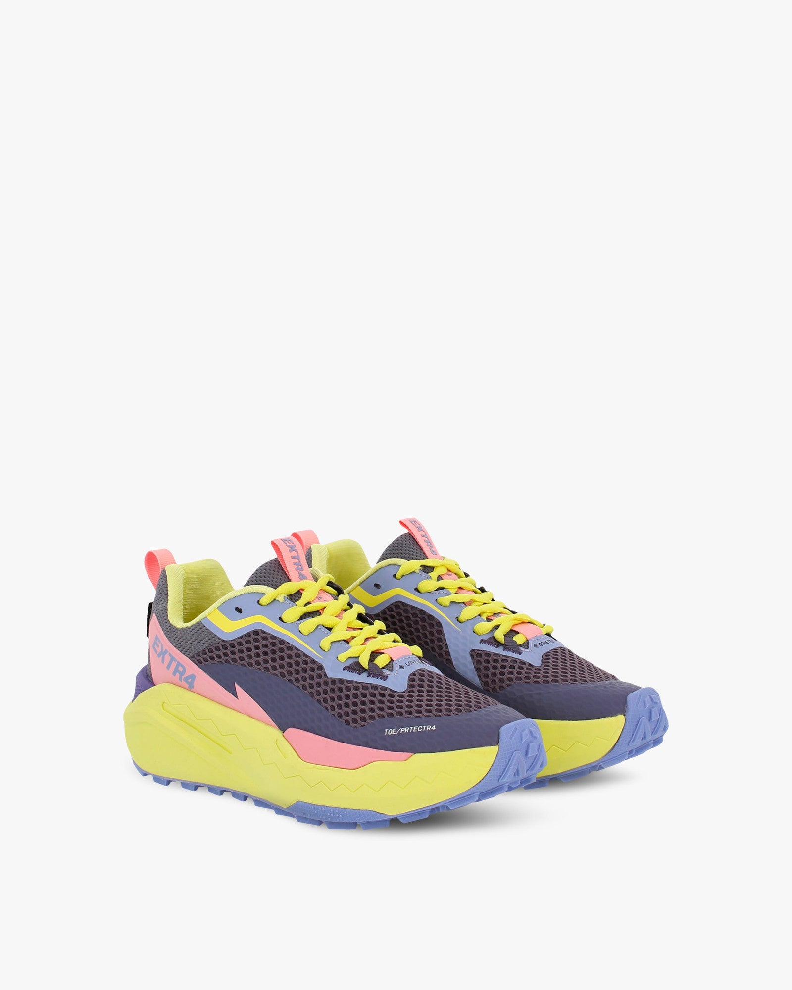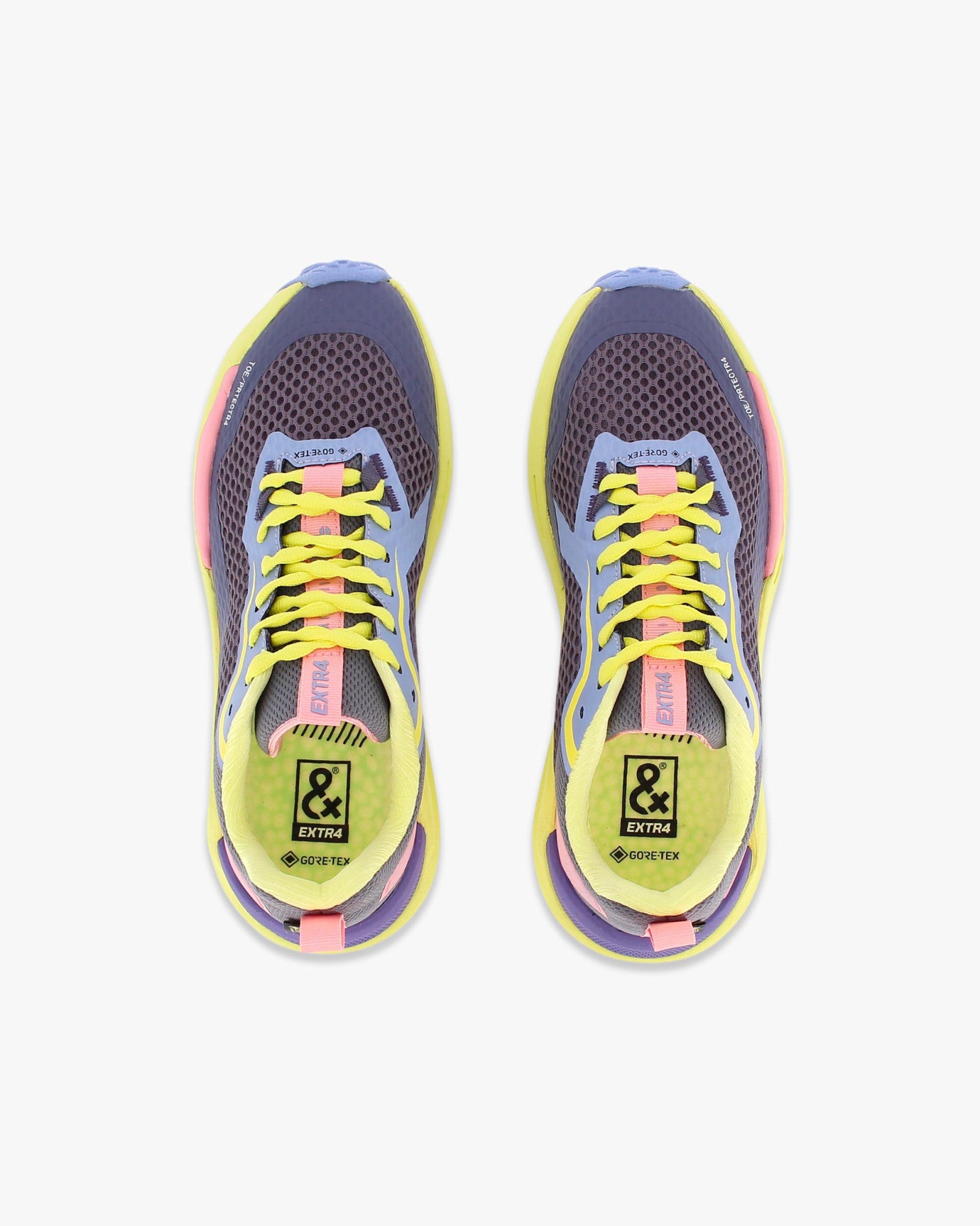 Sneakers athleisure donna a taglio basso, dallo stile trail running e design aerodinamico. Tomaia in mesh strutturato con rinforzo in TPU e membrana GORE-TEX Invisible Fit impermeabile e traspirante. Collarino imbottito e sottopiede Rapid-Tech per comfort e ammortizzazione ottimali. Suola a 5 componenti con tasselli a V da 4 mm, intersuola in EVA e inserto in TPU per stabilità e trazione avanzate. Logo EXTR4 e dettagli tecnici dal carattere sportivo e deciso. Disponibile dal 37 al 41. Made in Italy.