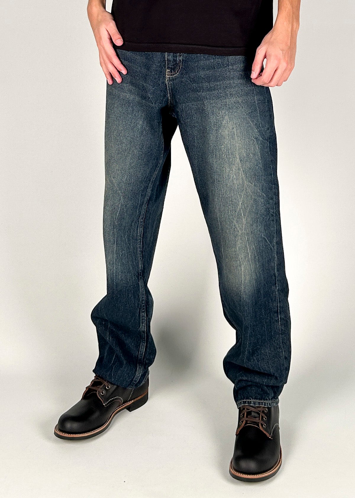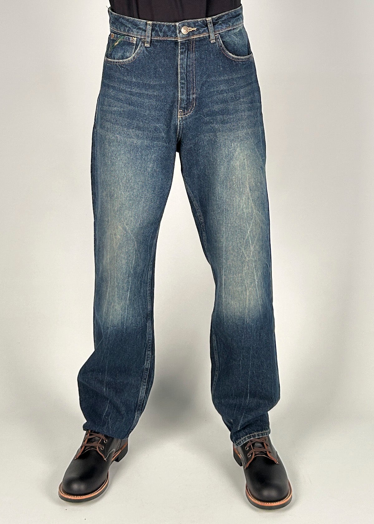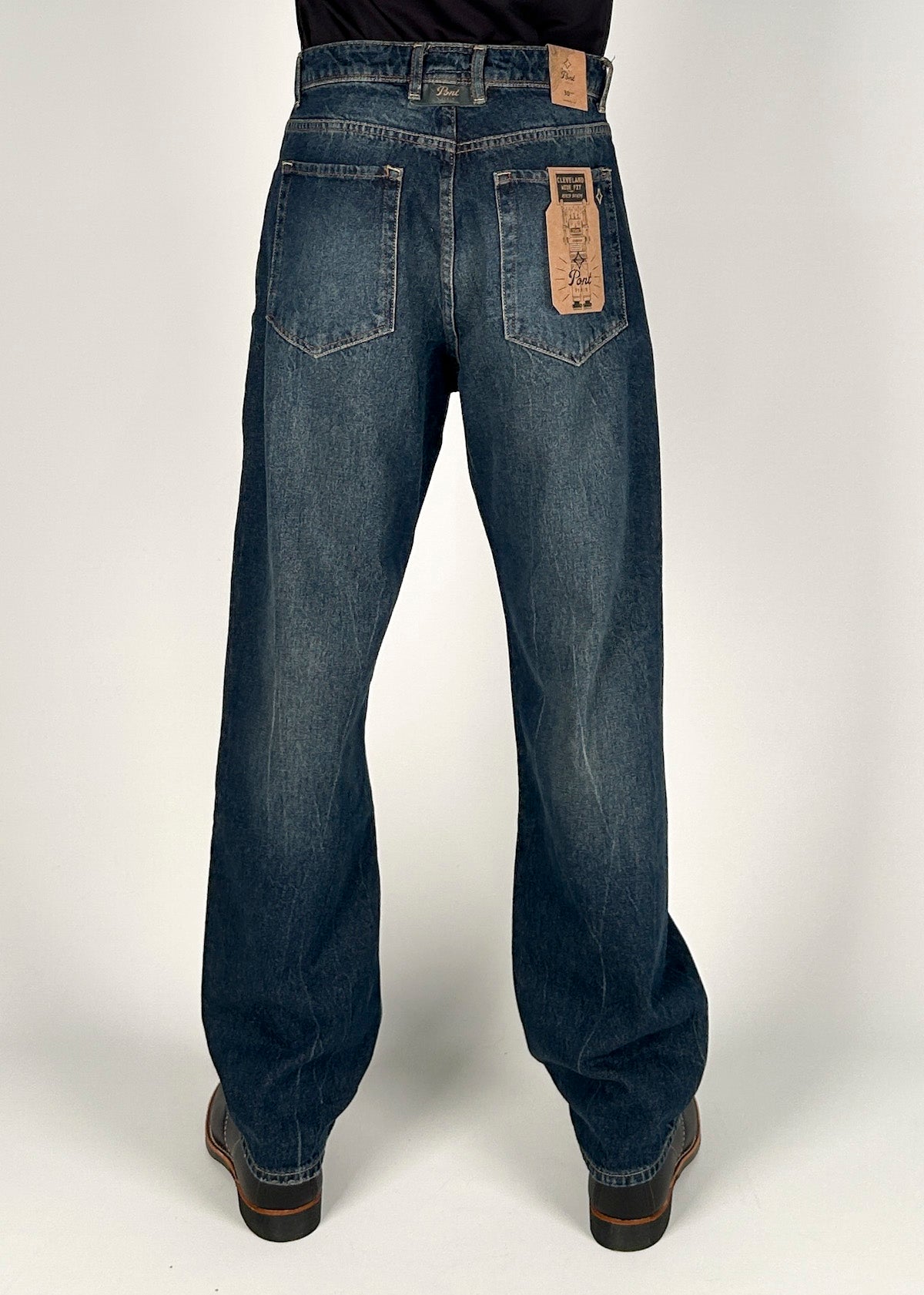 Jeans da uomo con vestibilità ampia. Chiusura frontale con zip e bottone, cinque tasche. Vita bassa, gamba e fondo largo. Realizzato in 100% cotone. Disponibile dalla 30 al 36.