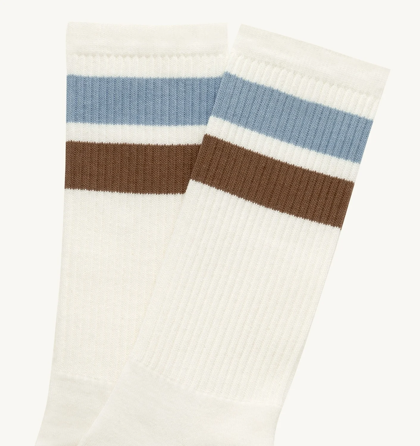Calzino unisex con strisce Jacquard azzurro e marrone, logo Jacquard sulla pianta del piede, polsini a costine e rinforzi su punta, suola e tallone. Disponibile dalla: S (35/38) M (39/42) L (43/47).