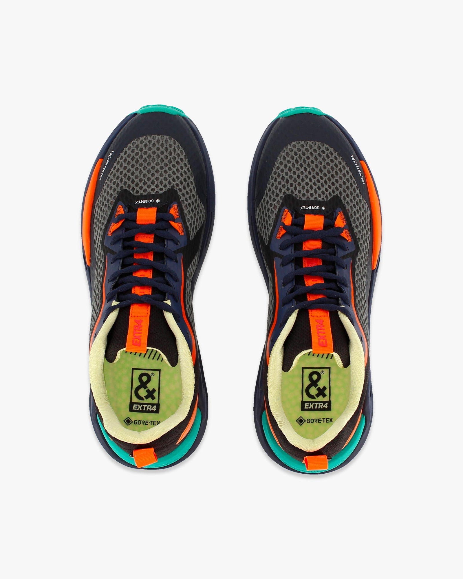 Sneakers athleisure uomo a taglio basso con ispirazione trail running e design urban-outdoor. Tomaia in mesh strutturato con rinforzo in TPU e membrana GORE-TEX Invisible Fit impermeabile e traspirante. Collarino imbottito e sottopiede Rapid-Tech per comfort e ammortizzazione. Suola a 5 componenti con tasselli a V da 4 mm, intersuola in EVA e inserto in TPU per stabilità e trazione avanzate. Logo EXTR4 e dettagli tecnici dal carattere sportivo e deciso. Made in Italy.
