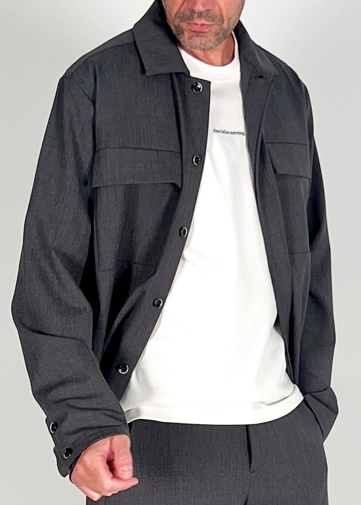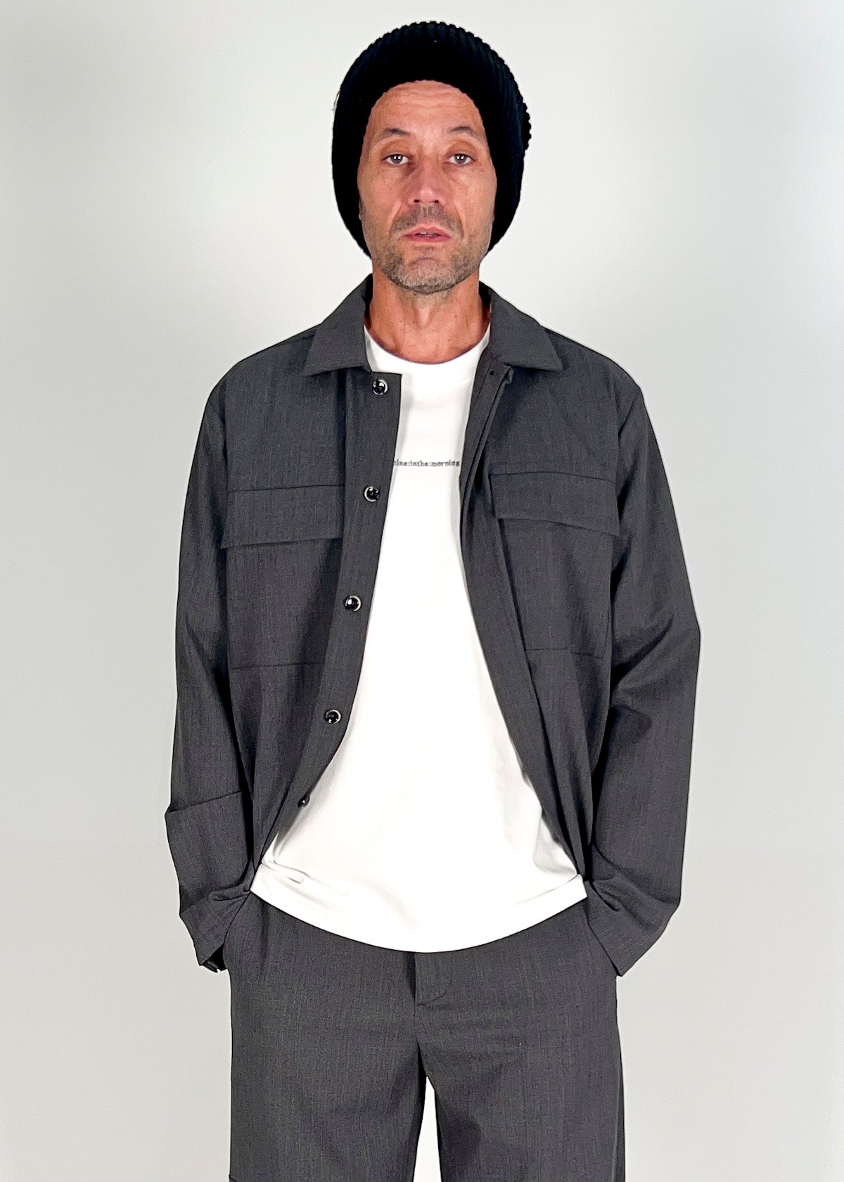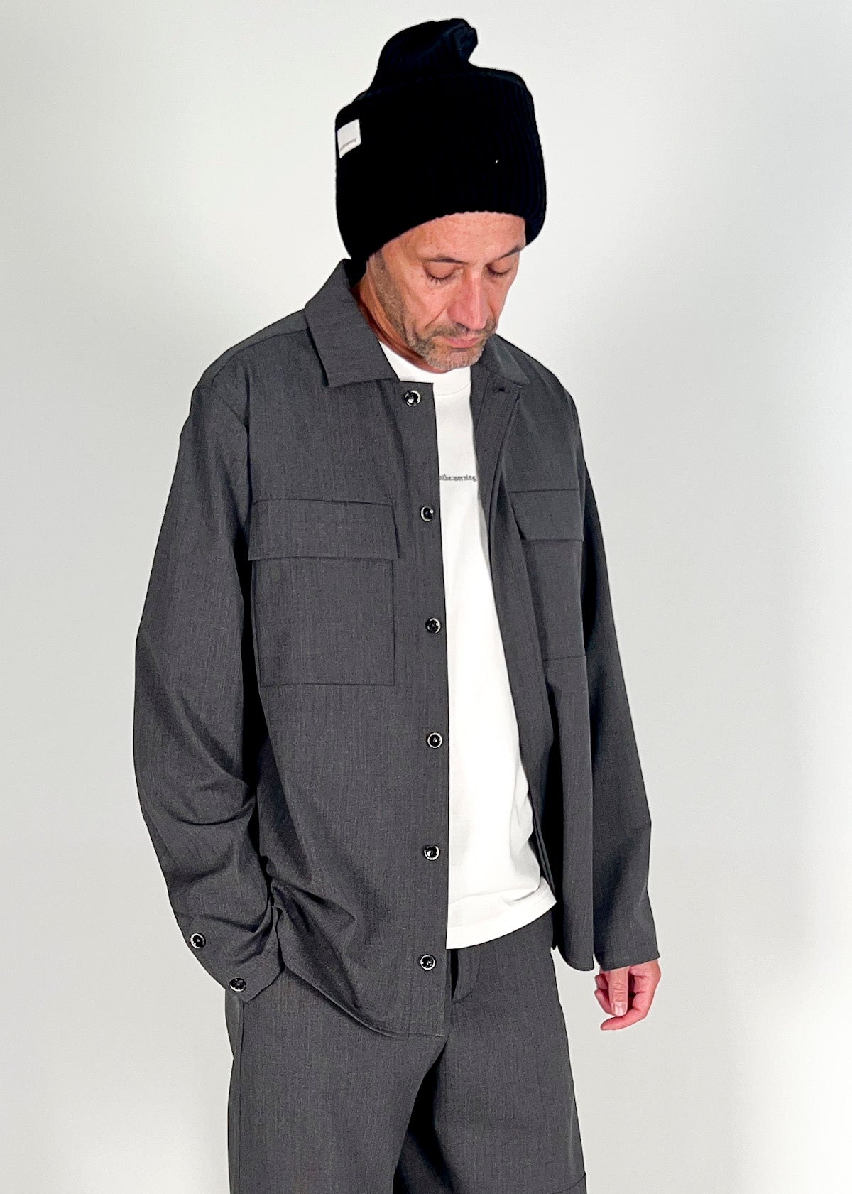 Overshirt in tessuto tecnico grigio, sfoderata, con collo e polsini stile camicia, chiusura a bottoni nascosta e due tasche davanti con patta. Vestibilità confort, disponibile dalla M alla XL.Il modello è alto 1.78m ed indossa la taglia M. Made in Italy.