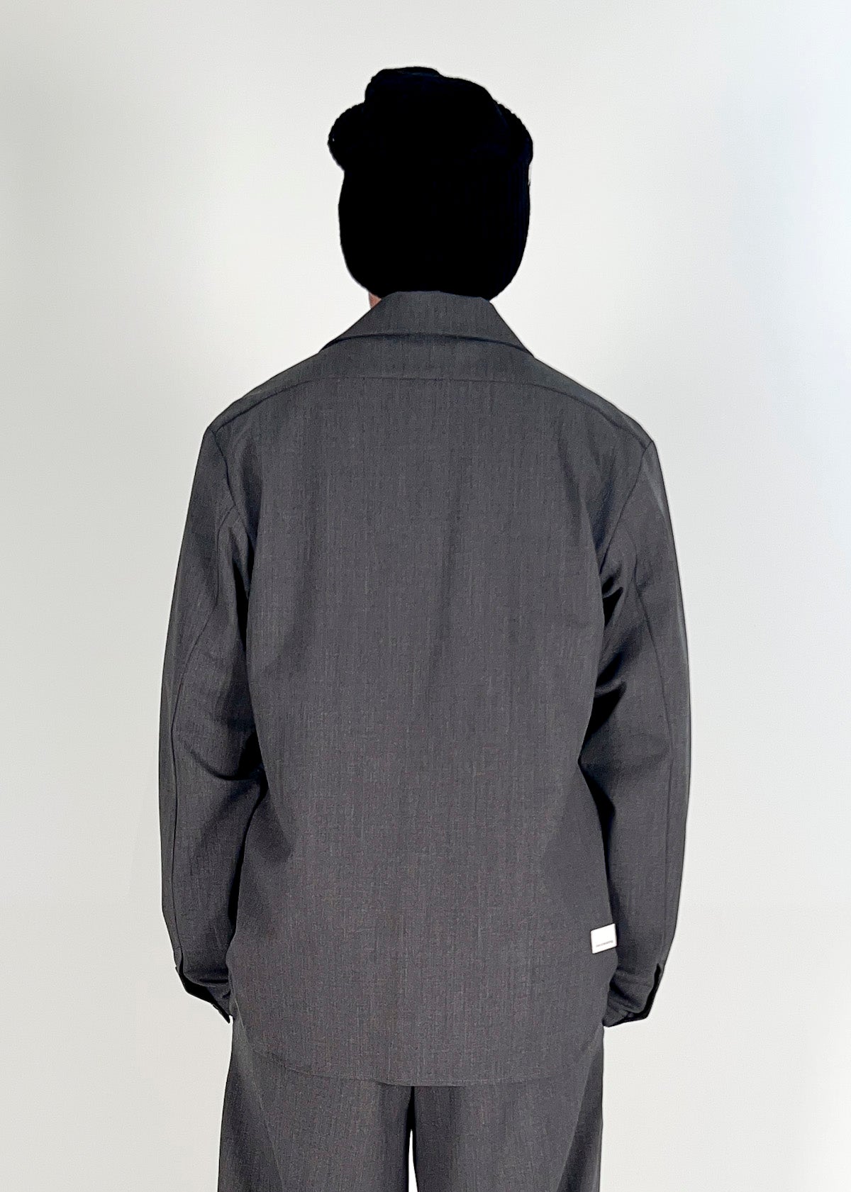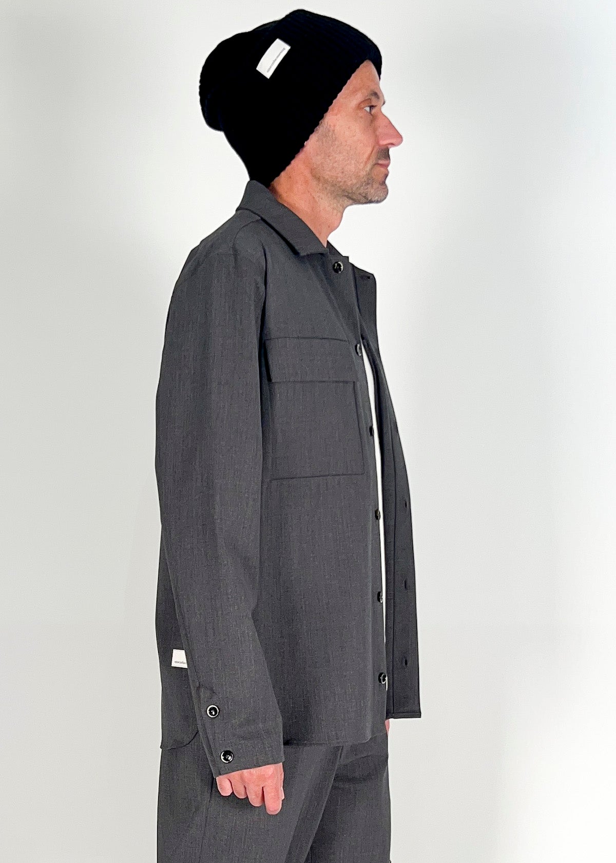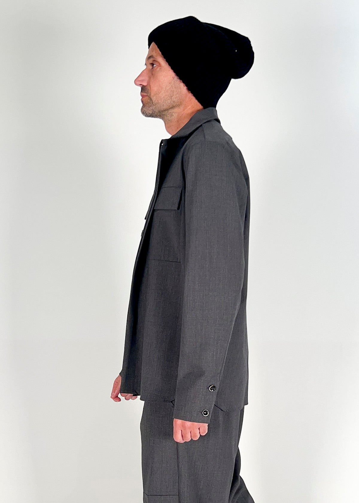 Overshirt in tessuto tecnico grigio, sfoderata, con collo e polsini stile camicia, chiusura a bottoni nascosta e due tasche davanti con patta. Vestibilità confort, disponibile dalla M alla XL.Il modello è alto 1.78m ed indossa la taglia M. Made in Italy.