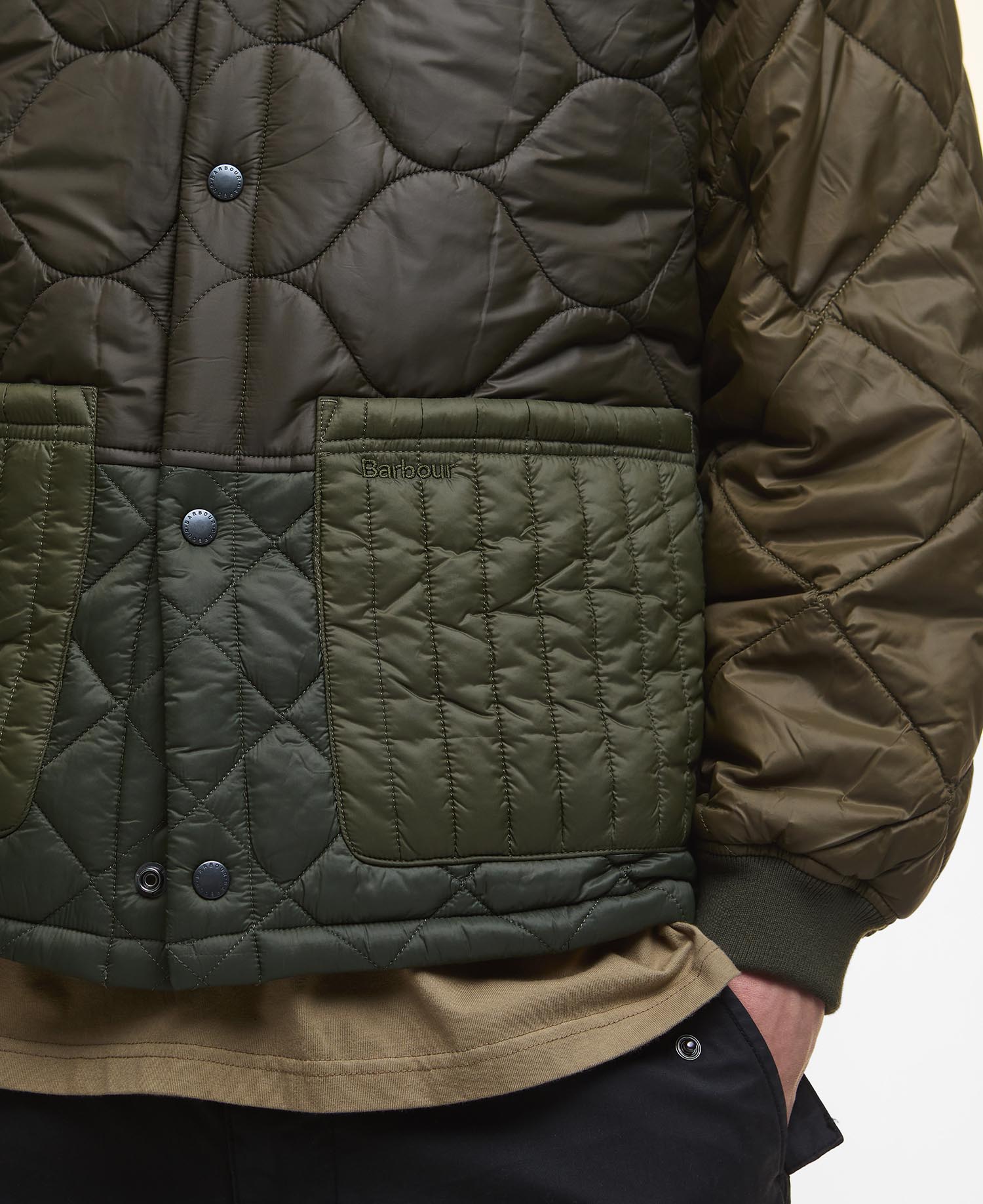 Giacca trapuntata Barbour Cording, rivisitazione moderna di un classico. Presenta pattern trapuntati mixati, dettagli tono su tono, colletto sportivo a coste e tasche a toppa, ideale per look a strati leggeri e raffinati. Disponibile dalla S alla L. Il modello è alto 1.85m ed indossa la taglia la taglia M. Made in Vietnam.