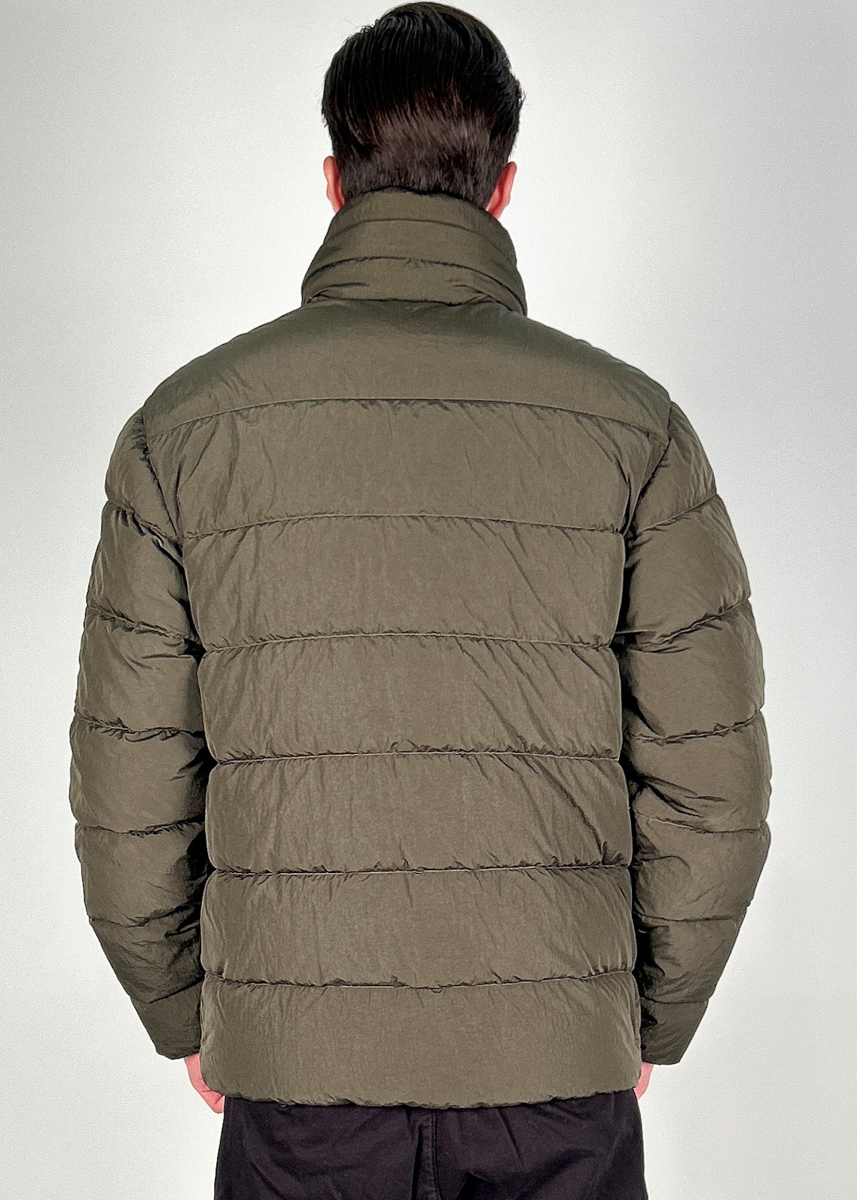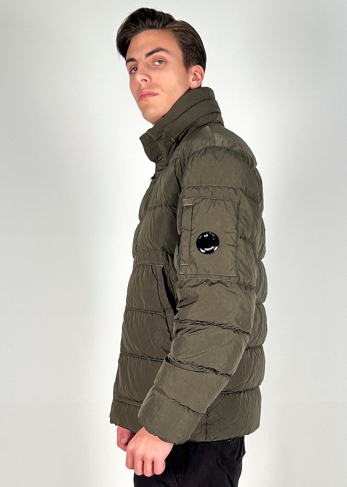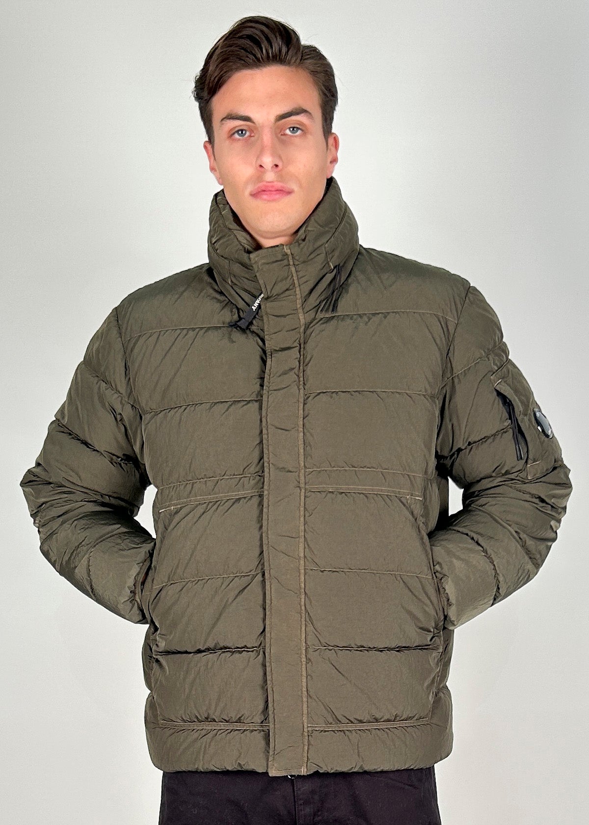 Piumino C.P. Company in nylon riciclato lucido, leggero e trattato anti-goccia. Cappuccio a scomparsa, chiusura zip nascosta, tasche laterali e iconica Lente C.P. Company. Polsini elasticizzati e orlo regolabile. Vestibilità regular. Diponibile dalla S alla XL. Il miodello è alto 1.86m ed indossa la taglia M. Made in China.