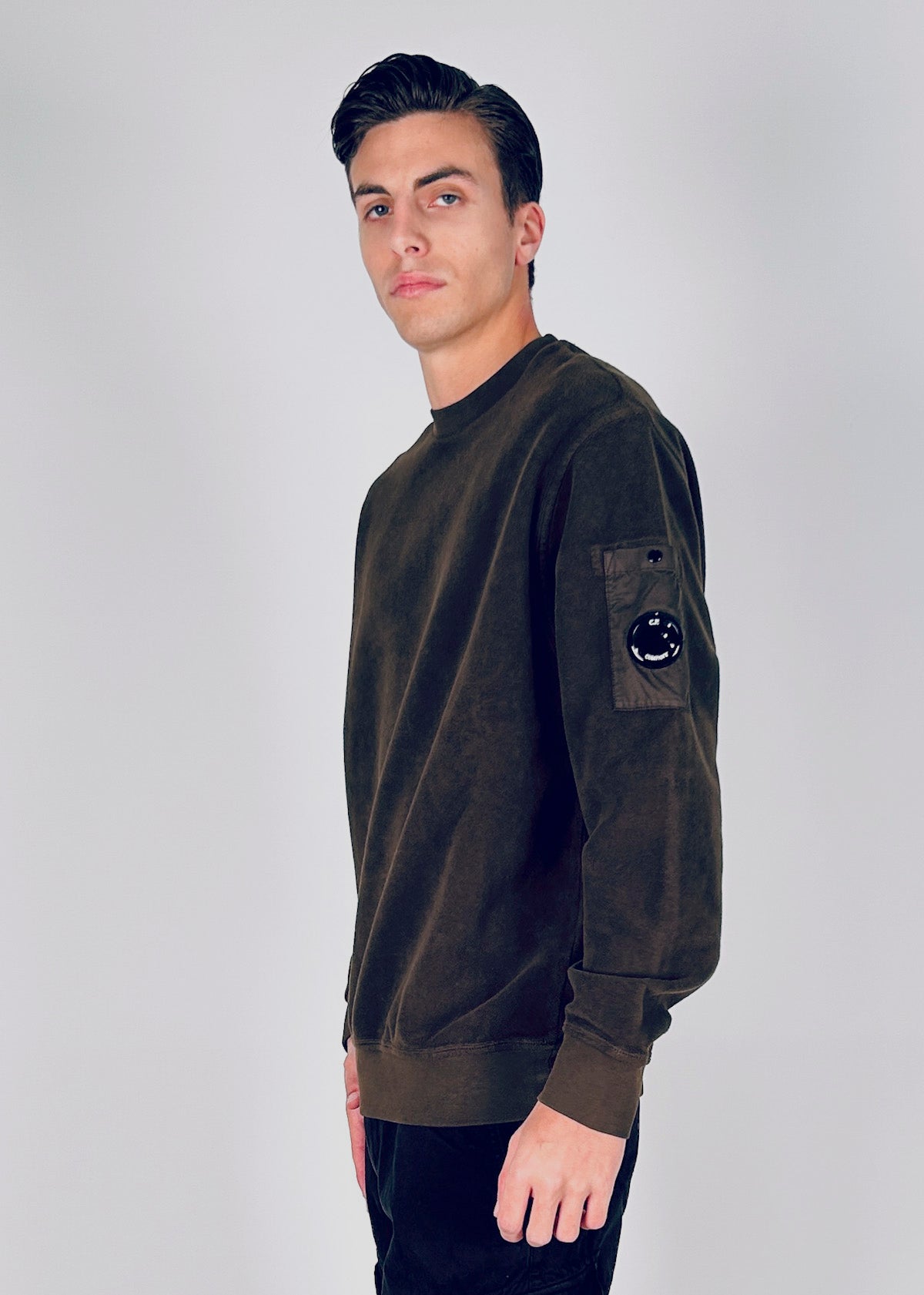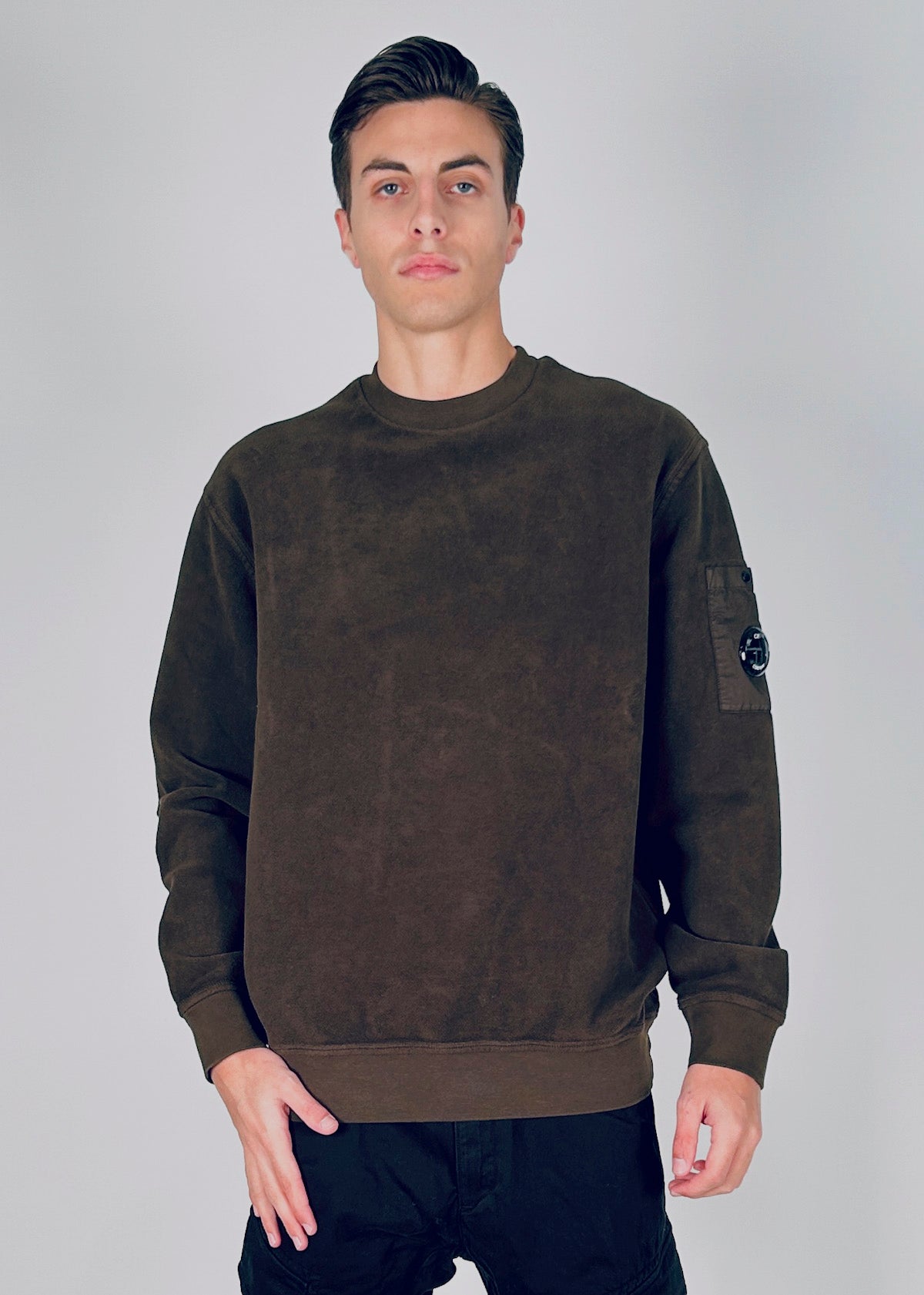 Felpa girocollo in fleece di cotone garzato con inserti in twill, caratterizzata dall’iconica Lente C.P. Company. Presenta polsini e orlo a costine, taschino con Lente e vestibilità regular. Tinta in capo. Disponibile dalla S alla XL. Il modello è alto 1.86m ed indossa la taglia M. Made in Turchia.