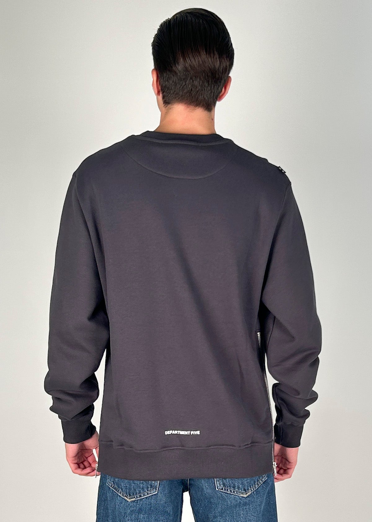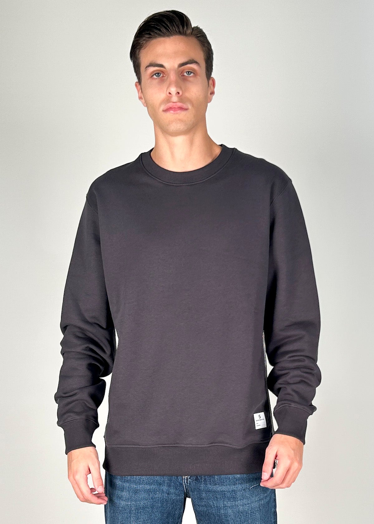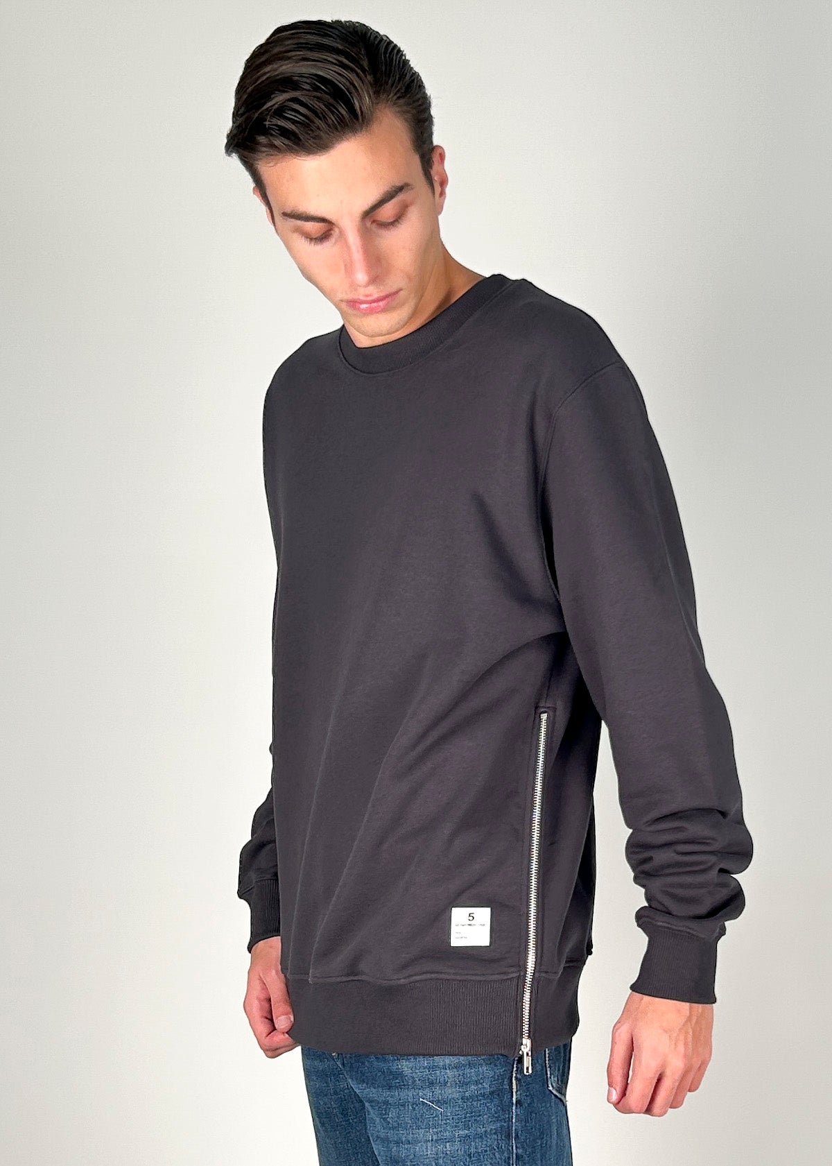 Felpa grigia in cotone con zip laterale, garzata, maniche lunghe, finiture a coste, etichetta e micro stampa logo sul retro. Regular fit, disponibile dalla S alla XL. Il modello è alto 1.86m ed indossa la taglia M. Made in Italy.