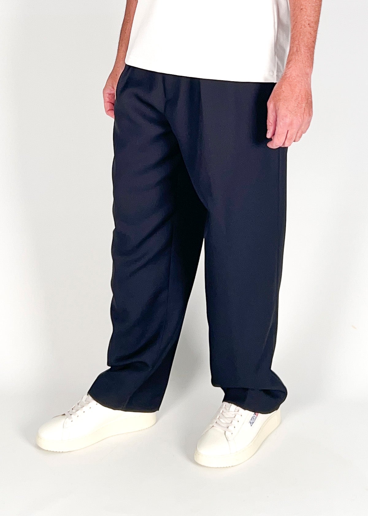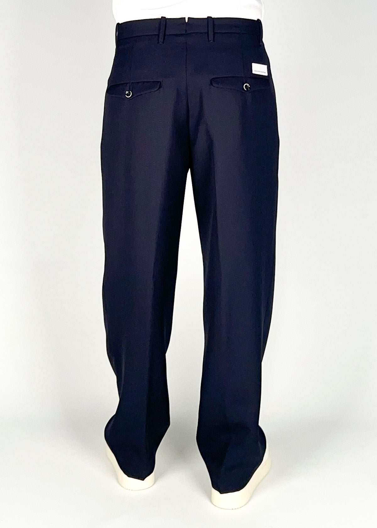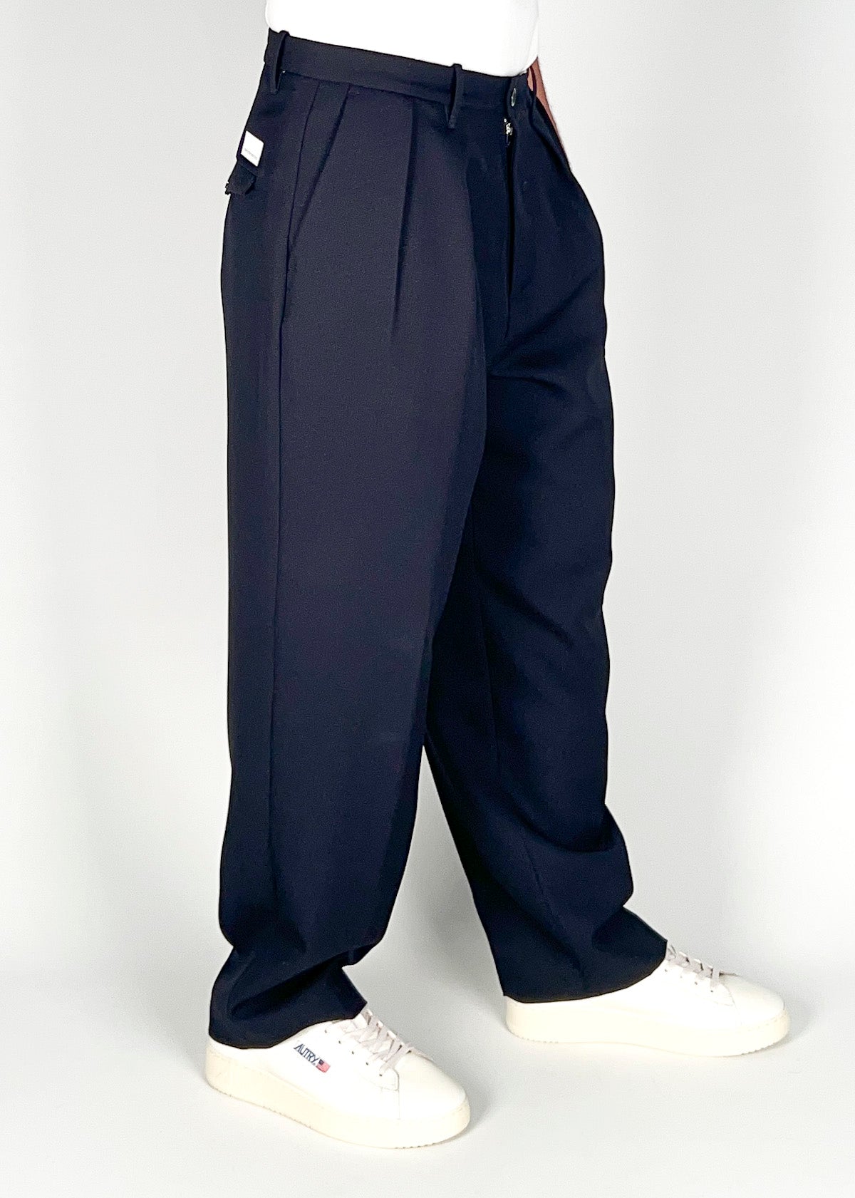 Pantalone in lana tecnica, baggy con pinces davanti e tasche con pattina e bottone dietro. Diisponibile dal 44 al 50. Il modello è alto 1.78m ed indossa la taglia 46. Made in Italy.