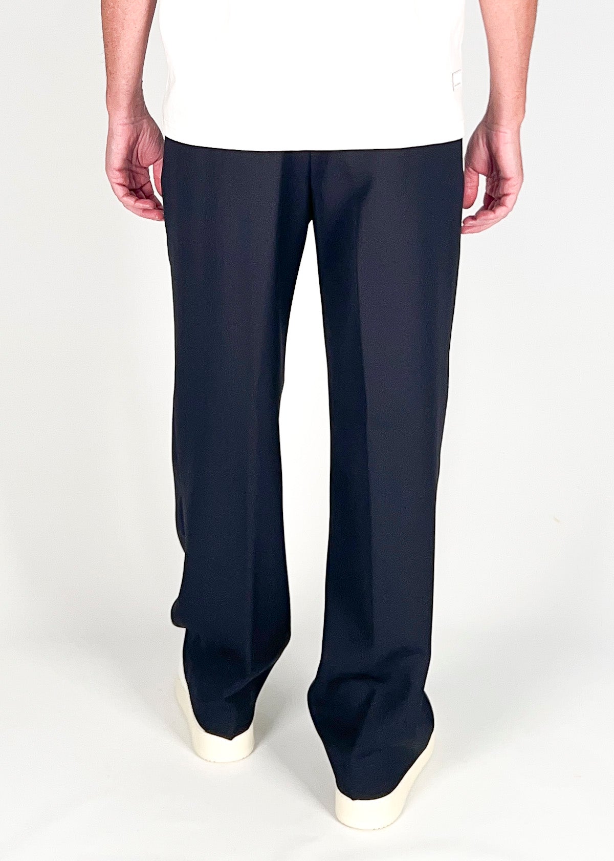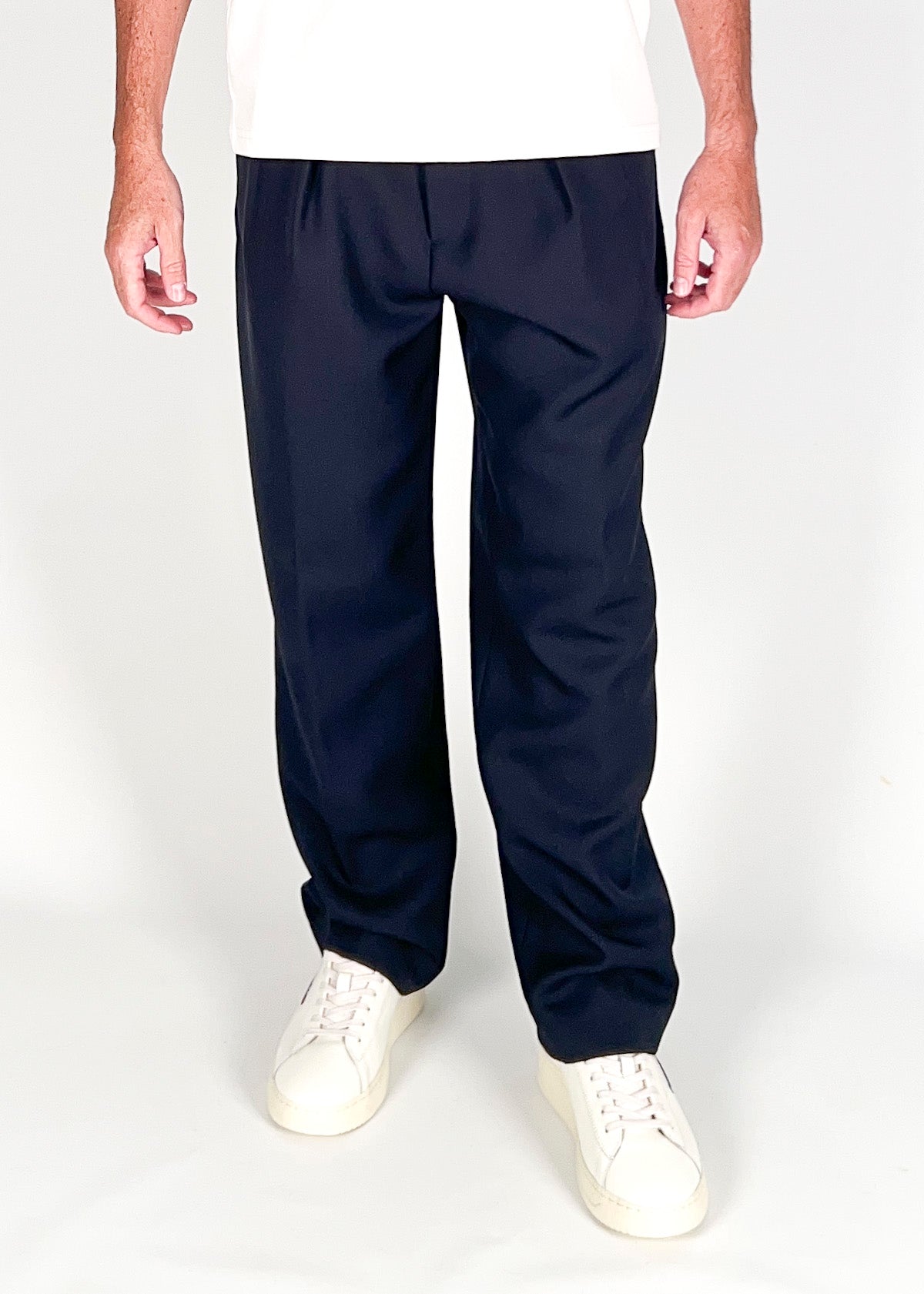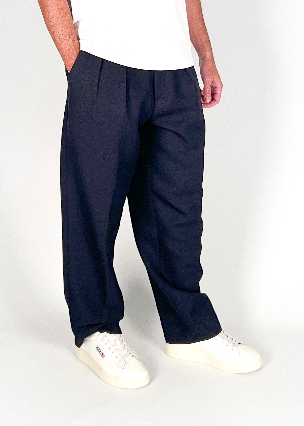 Pantalone in lana tecnica, baggy con pinces davanti e tasche con pattina e bottone dietro. Diisponibile dal 44 al 50. Il modello è alto 1.78m ed indossa la taglia 46. Made in Italy.