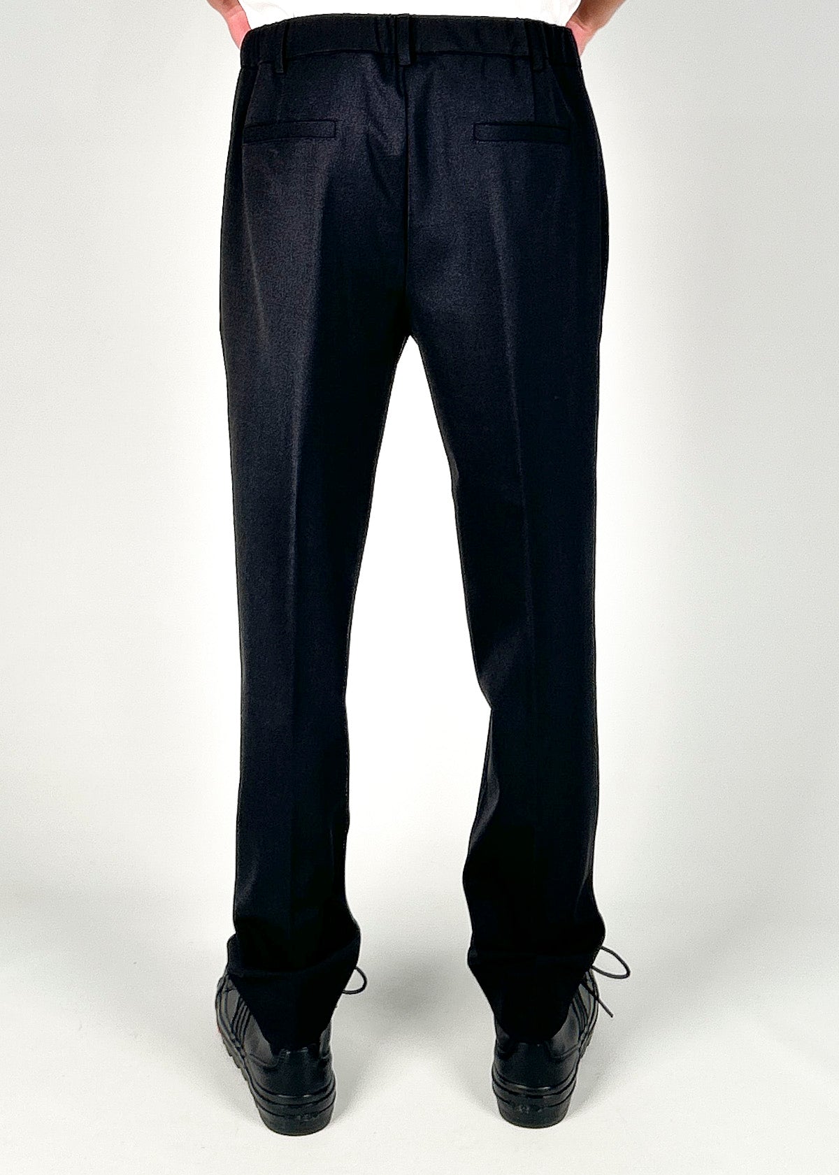 Pantalone regular fit di lana elasticizzata con elastico in vita e coulisse. Tasche america laterali e a filetto dietro. Disponibile dal 46 al 52. Il modello è alto 1.86m ed indossa la taglia 48. Made in Italy.