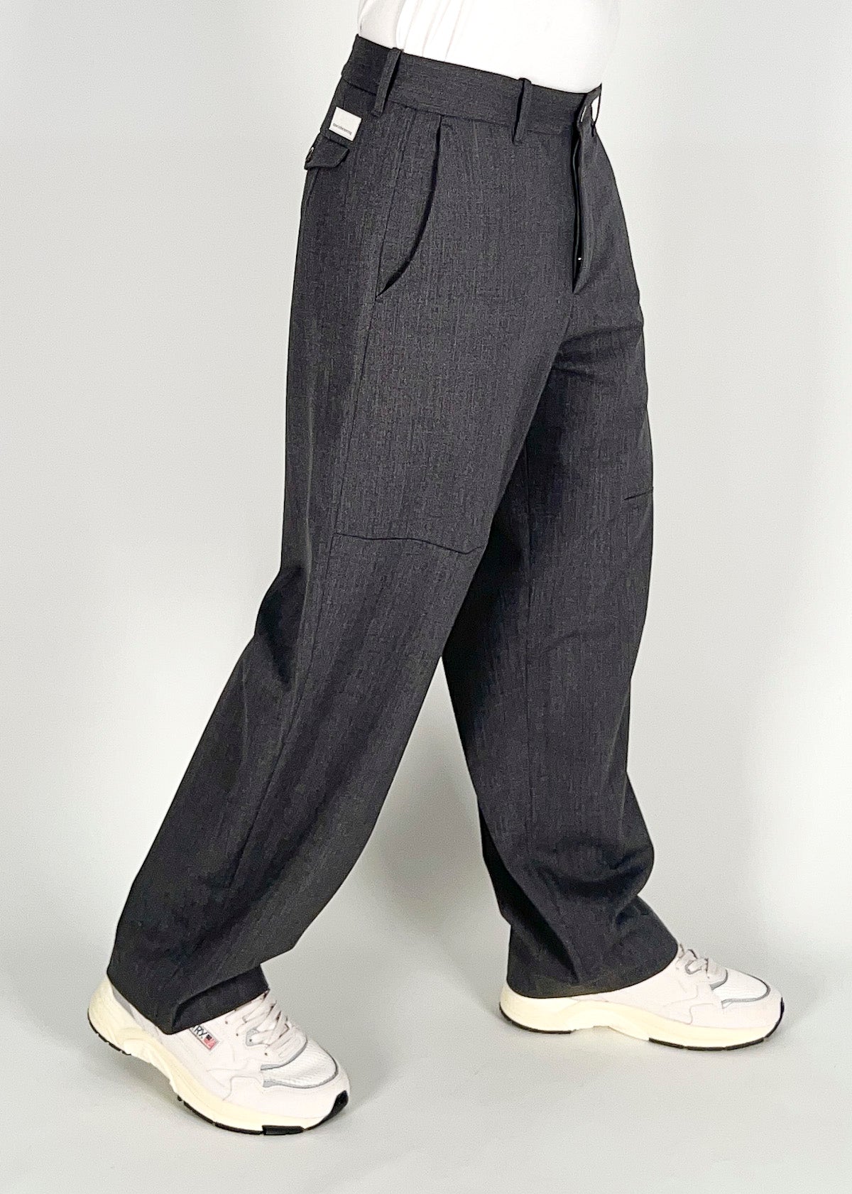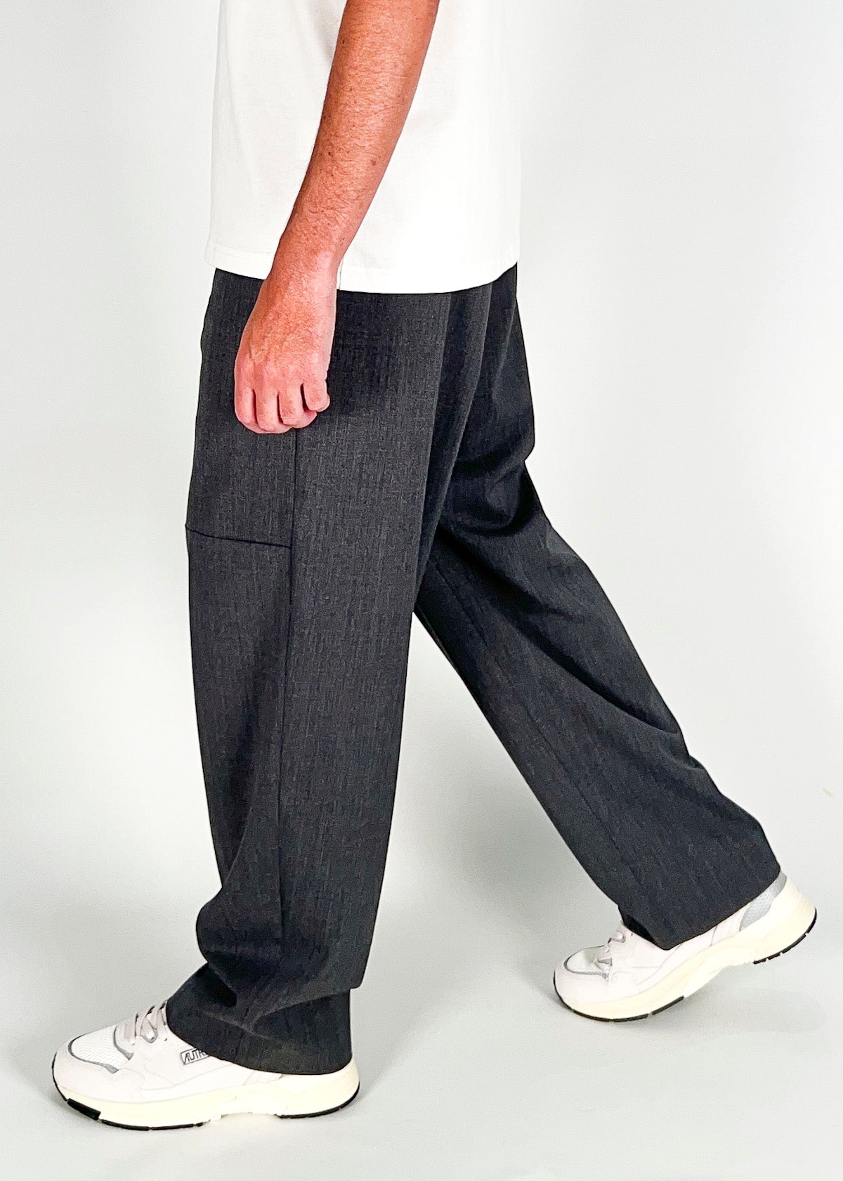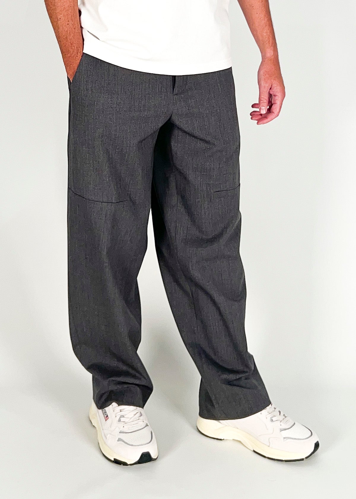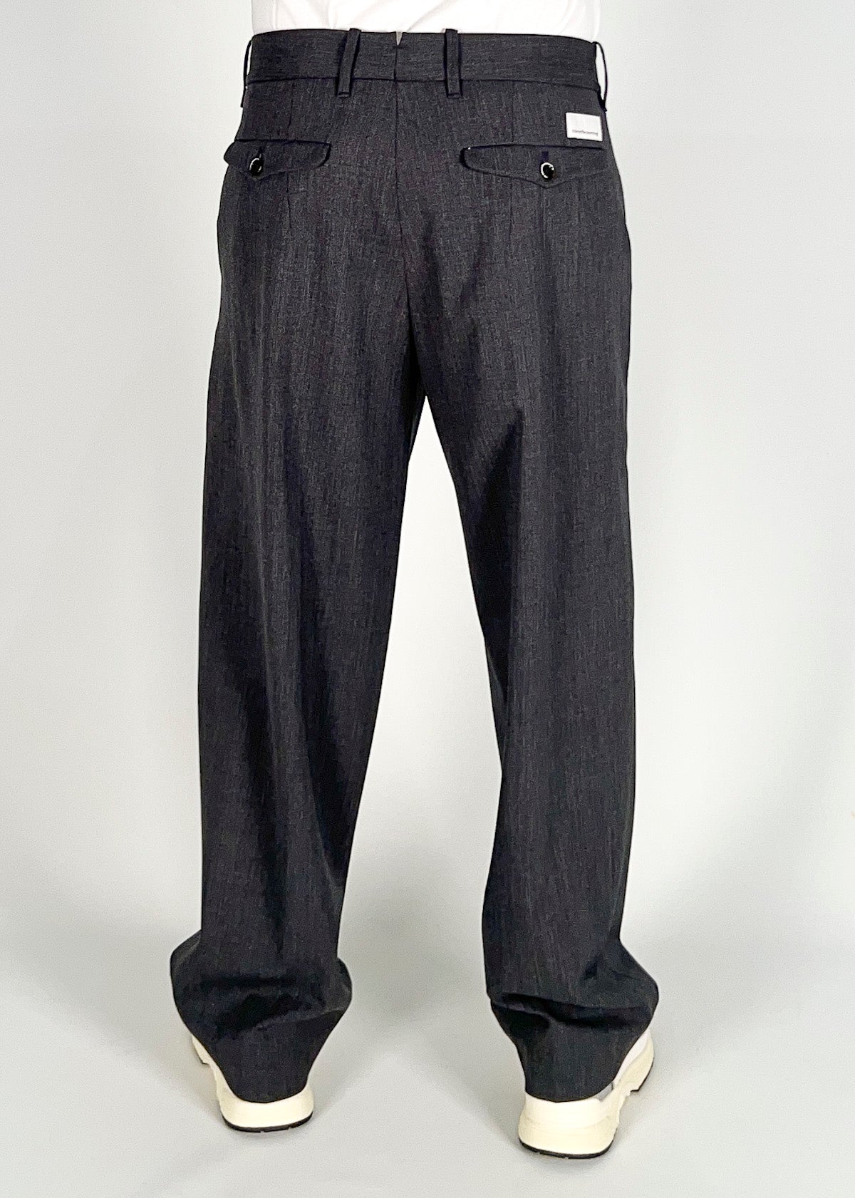 Pantalone in lana tecnica, loose fit con tasca america laterale con cucitura sul davanti dove finisce la tasca. Tasche a filetto dietro. Disponibile dal 44 al 50. Il modello è alto 1.78m ed indossa la taglia 46. Made in Italy.