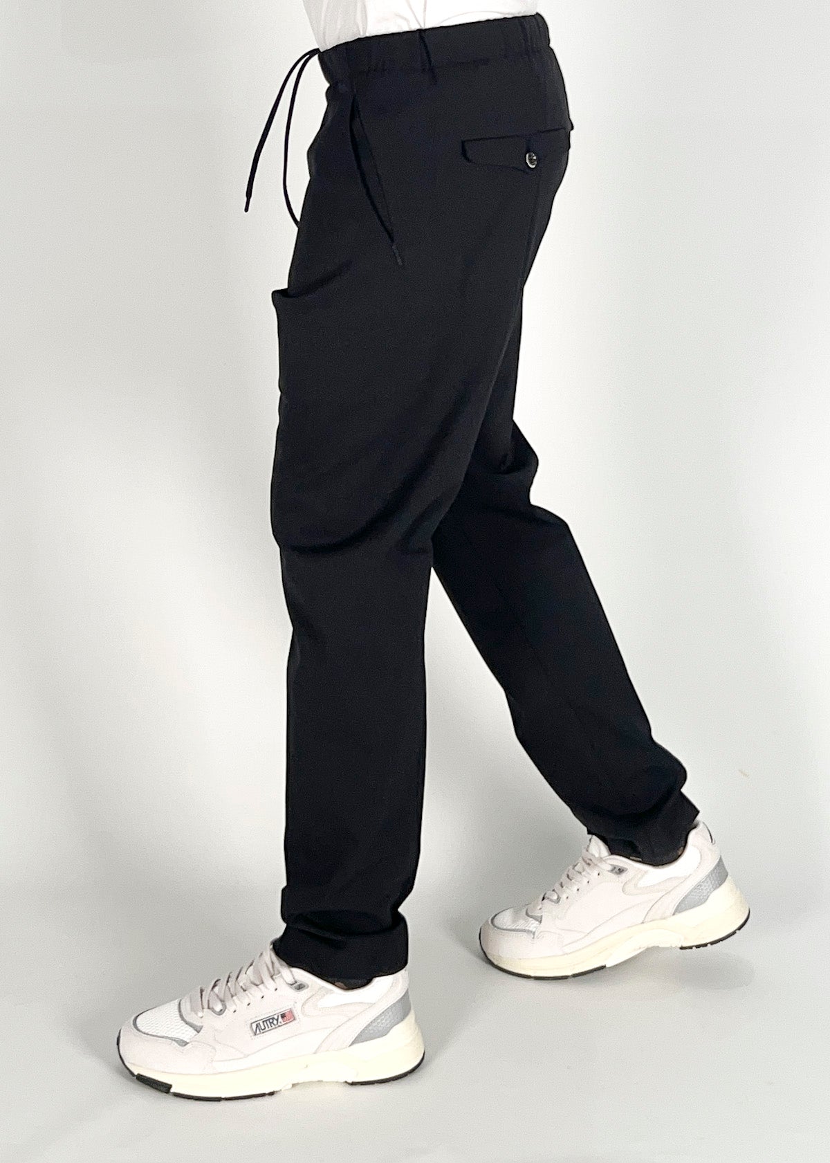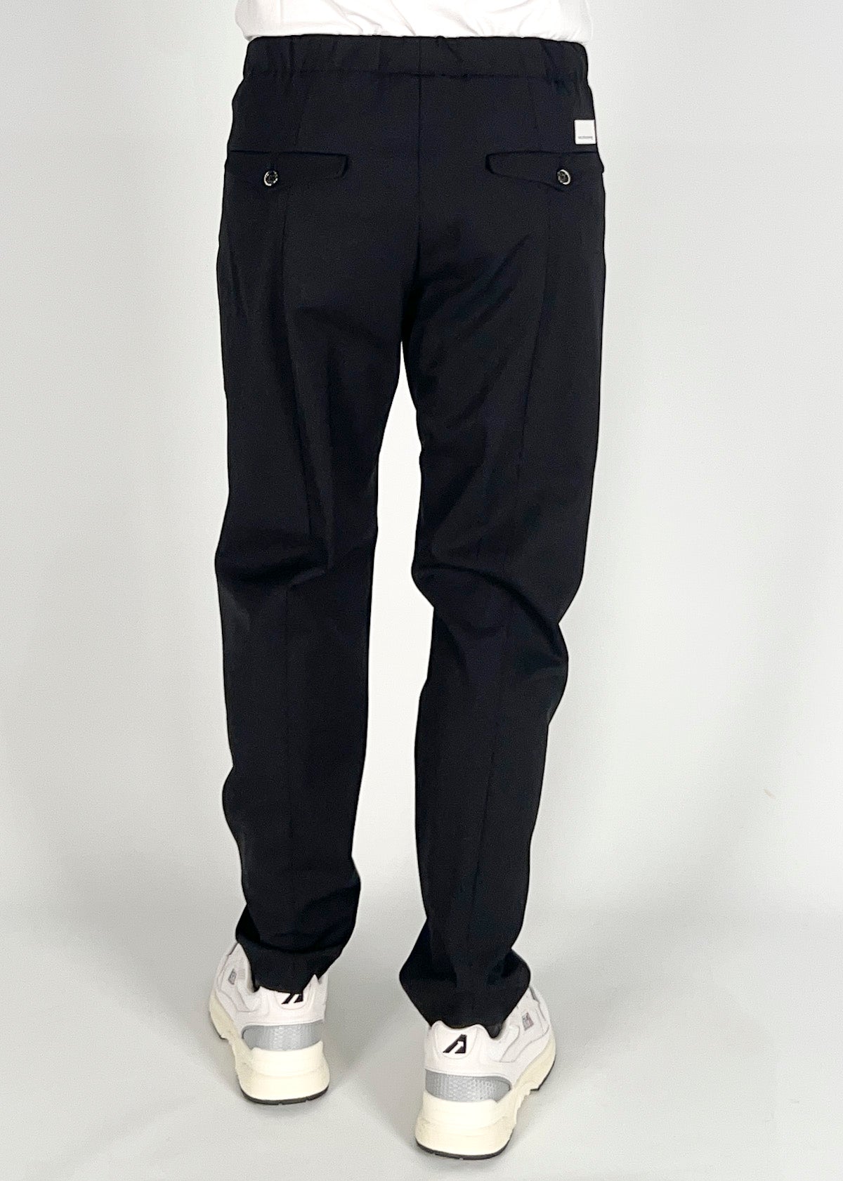 Pantalone uomo carrot con elastico in vita e coulisse. Tasche america laterali e dietro tasche con pattina e bottoni. Disponibile dal 44 al 50. Il modello è alto 1.78m ed indossa a taglia 46. Made in Italy.