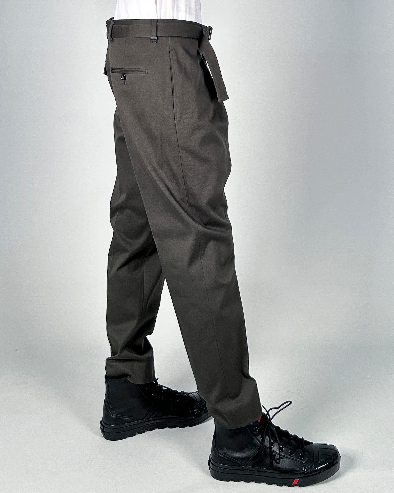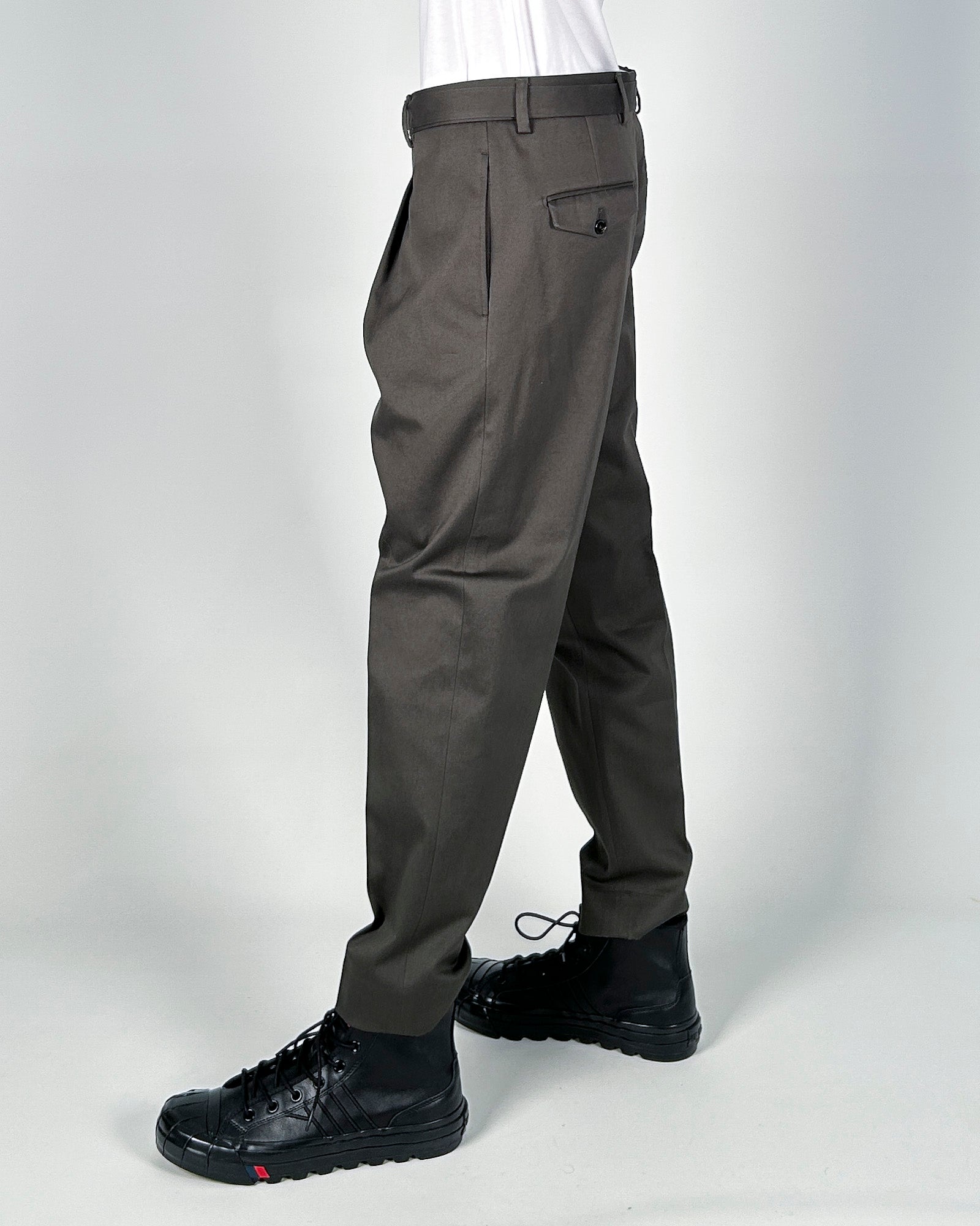 Pantalone con tasca laterale,con pences, pattina posteriore e cintura in tessuto nei passanti. Pantalone in cotone con tasche laterali a filo, tasche posteriori con pattina e abbottonatura con bottone e zip. Carrot fit, disponibile dalla 30 alla 36. Il modello è alto 1.86m ed indossa la taglia 32. Made in Italy.