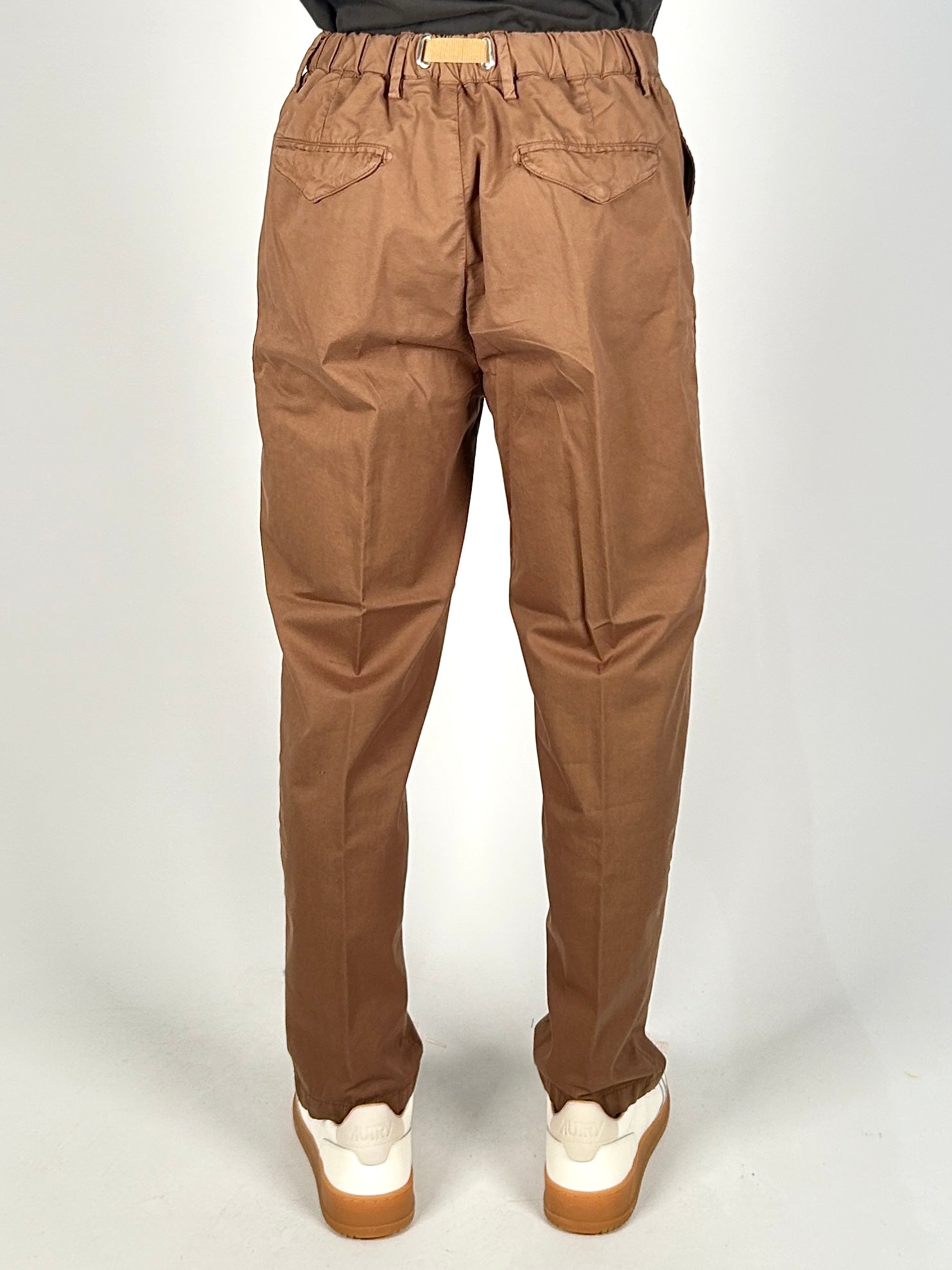 Pantalone dal design utility-sartoriale con doppia pence frontale e vestibilità morbida ma definita. Caratterizzato da vita elasticizzata con cintura in grosgrain regolabile e fibbia a scatto, garantisce comfort e stile. Realizzato in gabardina di cotone stretch, offre traspirabilità e libertà di movimento. Dotato di tasche laterali a scomparsa, tasche posteriori e dettaglio iconico della pietra applicata, è un capo Made in Italy ideale per un look contemporaneo e raffinato. Il modello è alto 1.75 m ed indossa la taglia 46. Disponibile dal 44 al 50.