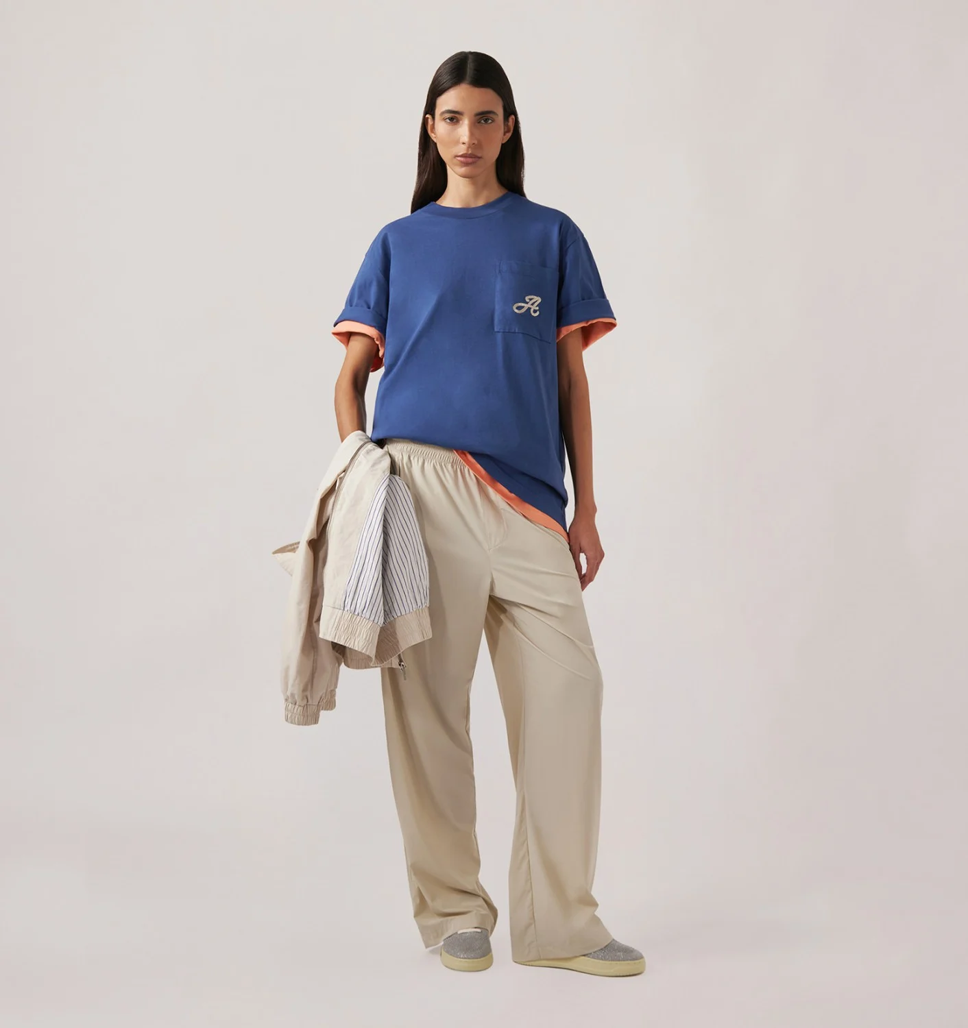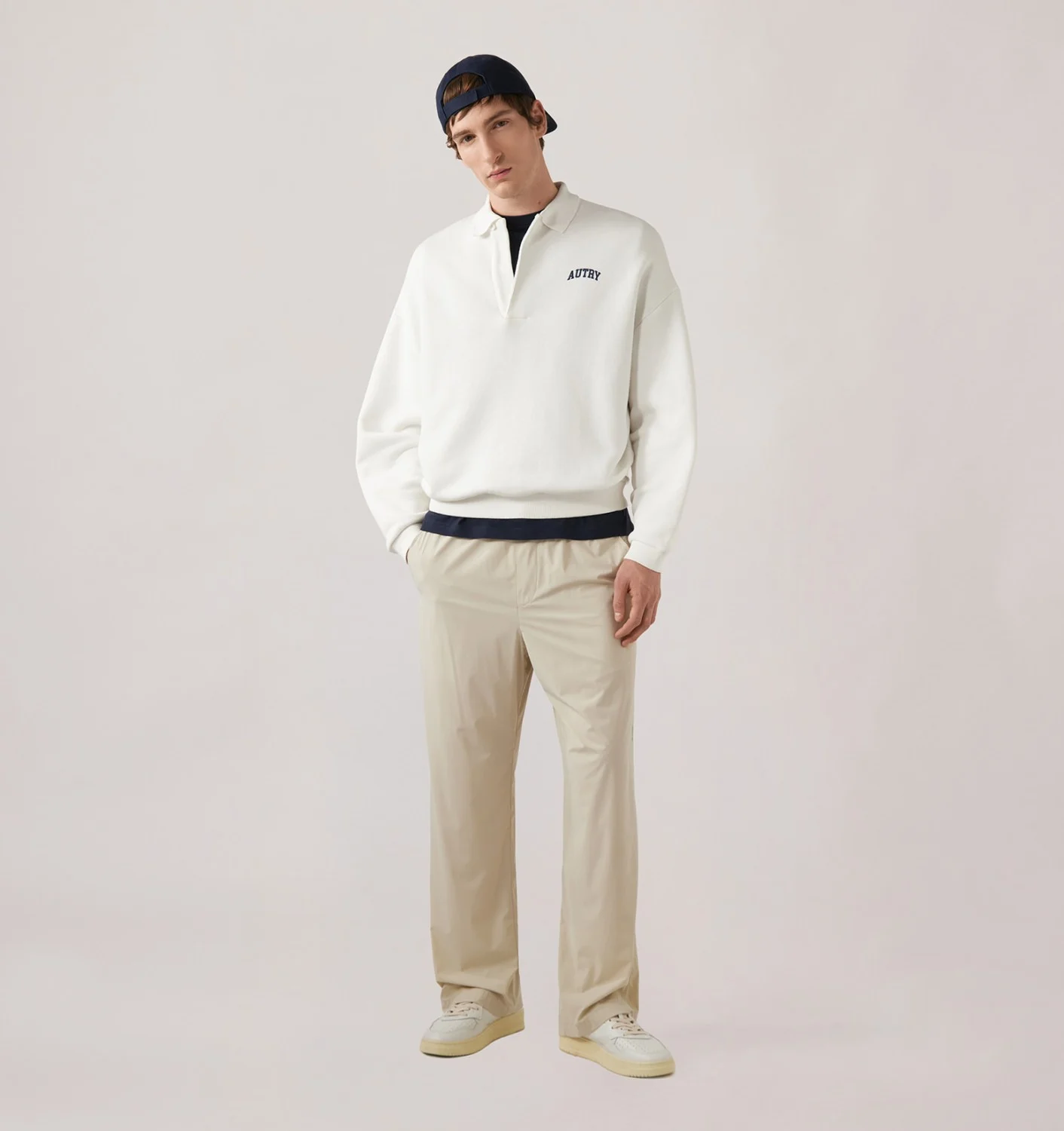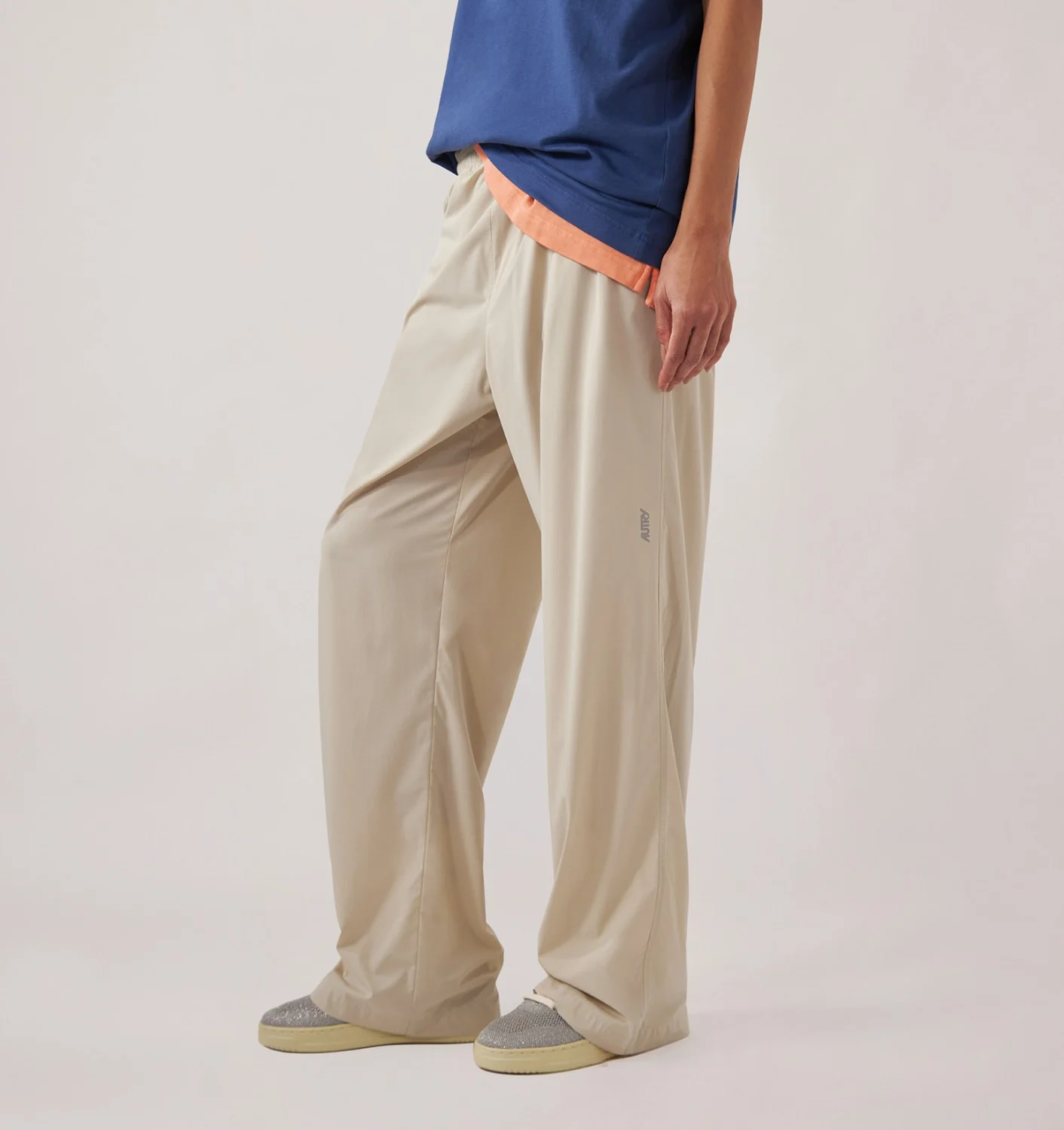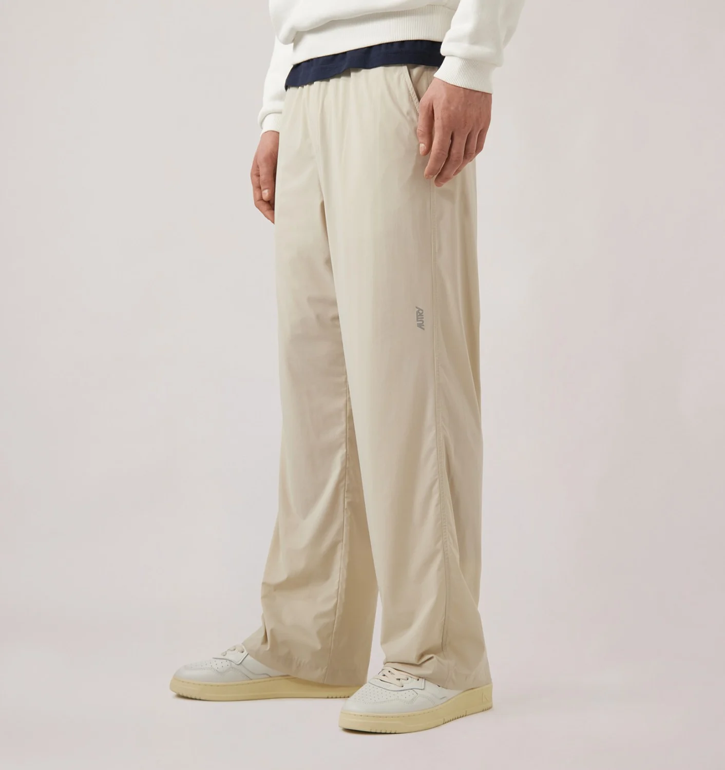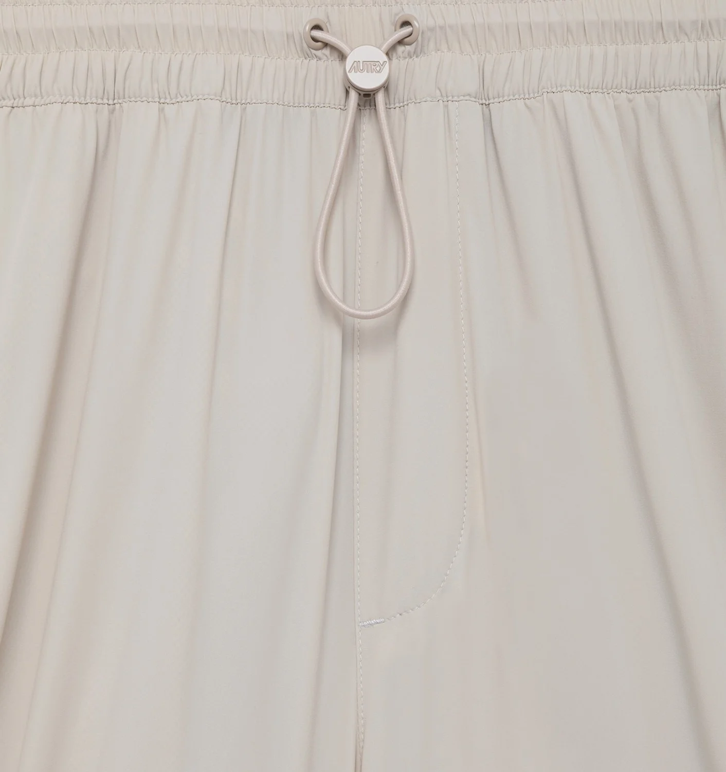 Pantaloni unisex in nylon beige e spandex, con vita elasticizzata regolabile, gamba dritta, tasche laterali e posteriori a filetto, e logo Autry riflettente. Disponibile dalla XS alla L.