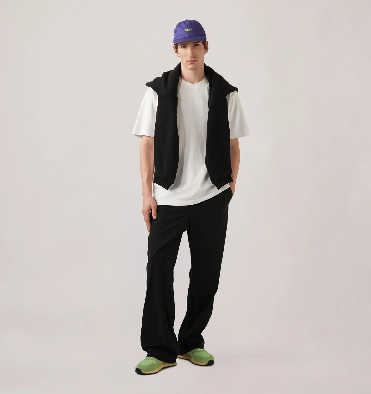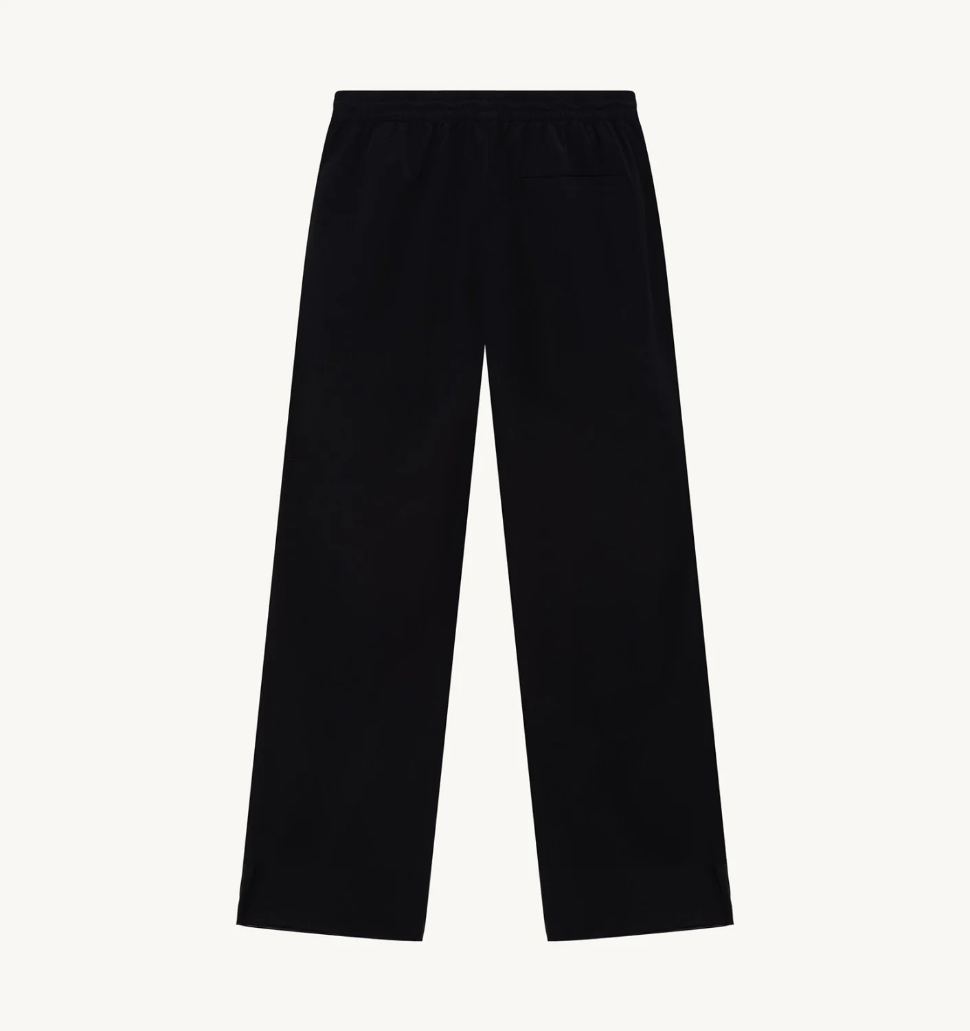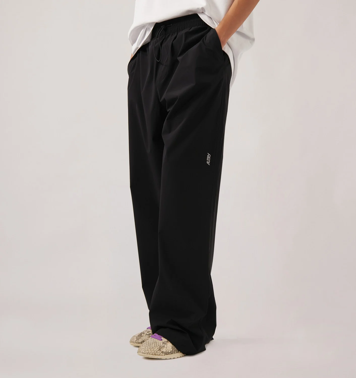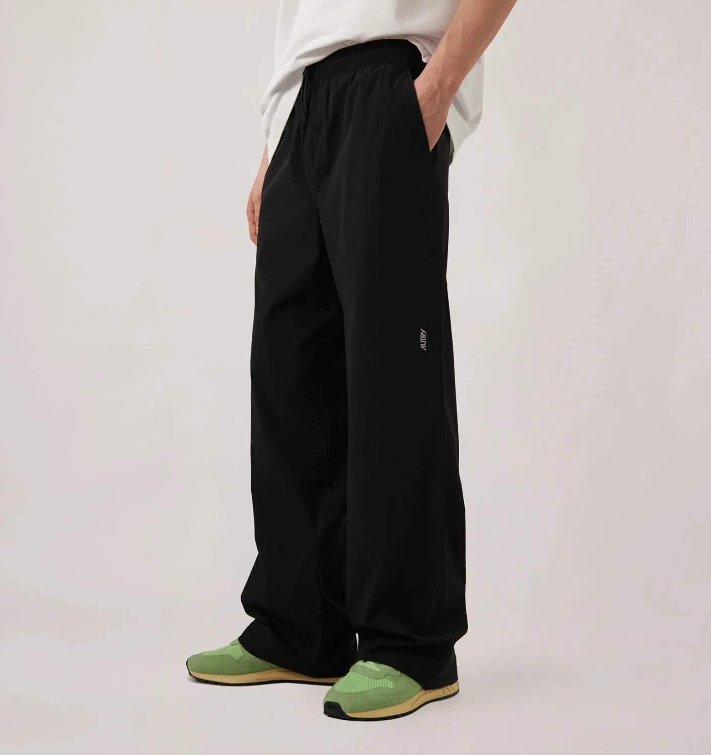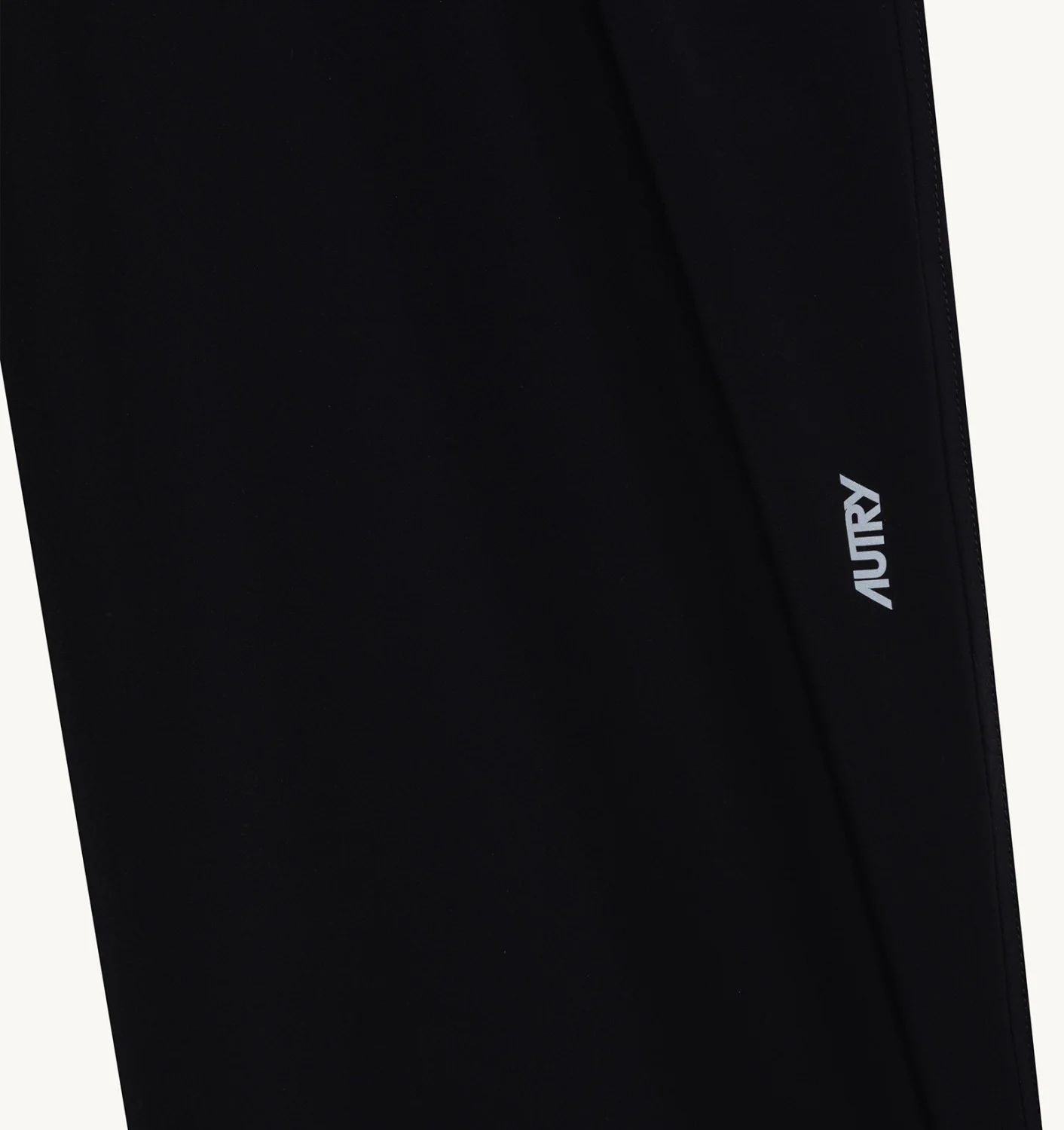 Pantaloni unisex in nylon nero e spandex, con vita elasticizzata regolabile, gamba dritta, tasche laterali e posteriori a filetto, e logo Autry riflettente. Disponibile dalla XS alla L.