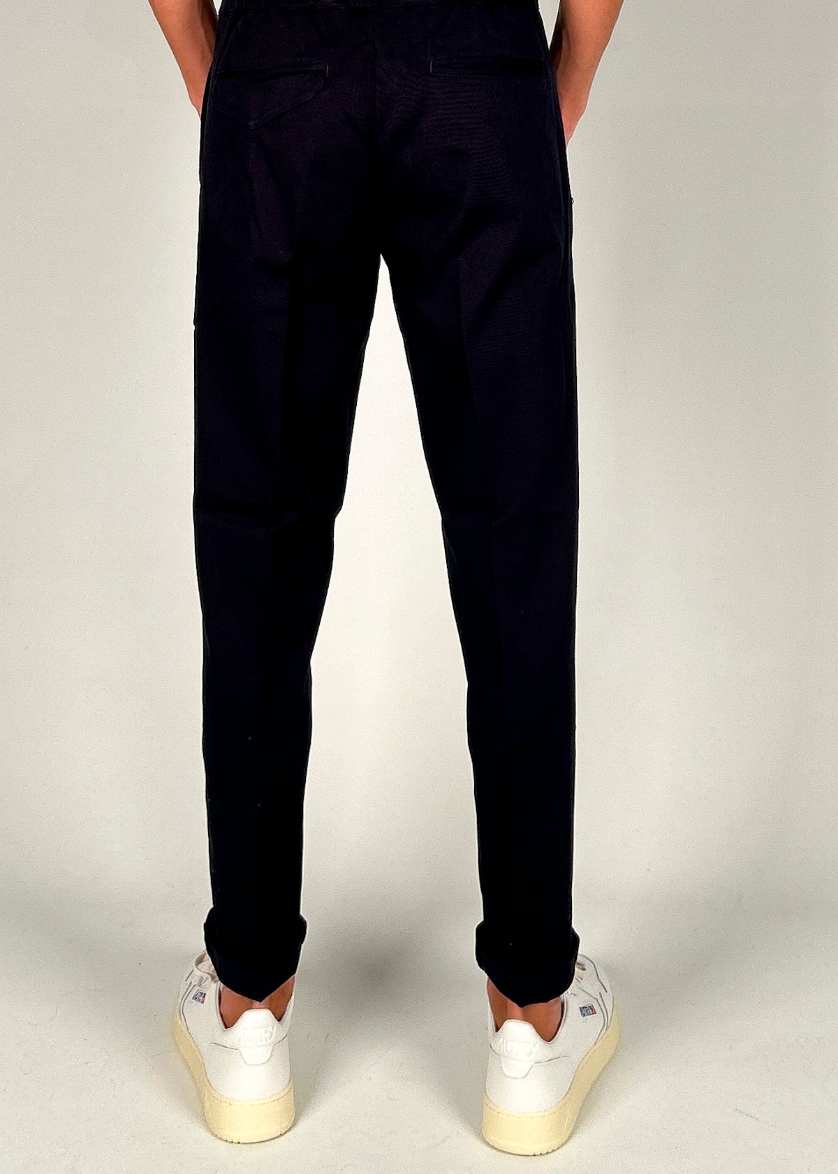 Pantalone in gabardina,tinta unita. Vita elasticizzata con coulisse regolabile e fibbia. Chiusura con zip.Tasche oblique anteriori e tasche posteriori, una a filetto e una con patta.Vestibilità comfort. Disponibile dalla 44 alla 54. Il modello è alto 1.86m ed indossa la taglia 46. Made in Italy.