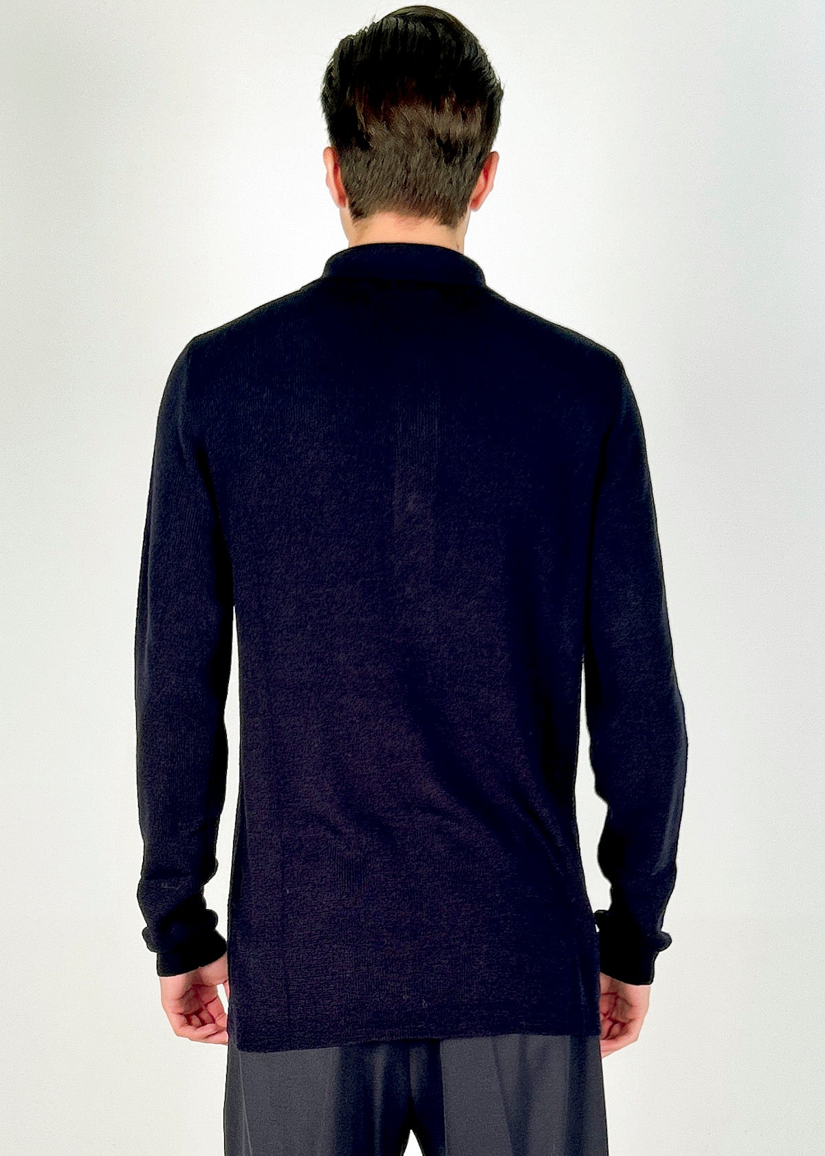 Maglione lana in maglia Grifoni lana con trama a coste sottili e scollo polo. Versatile e confortevole, presenta maniche lunghe, orlo dritto e un design classico. Regular fit, disponibile dalla 46 alla 52. Il modello è alto 1.86m ed indossa la taglia M. Made in Italy.