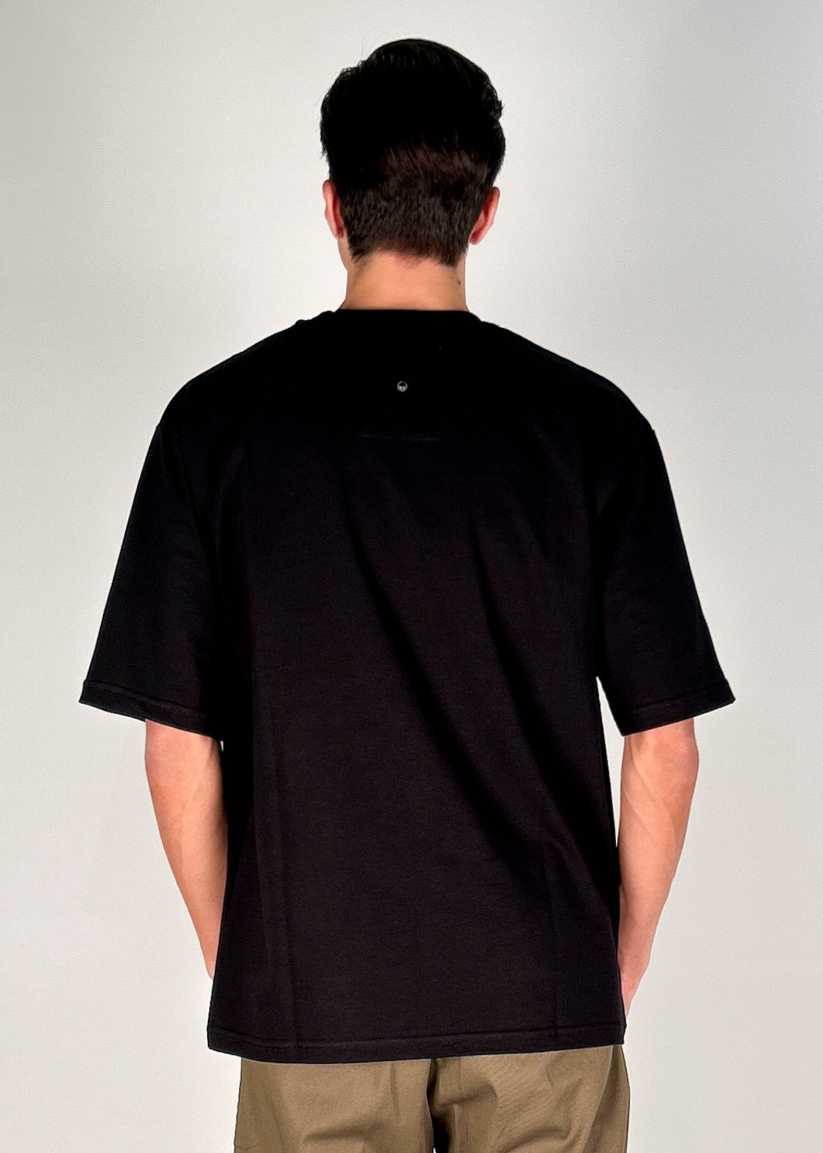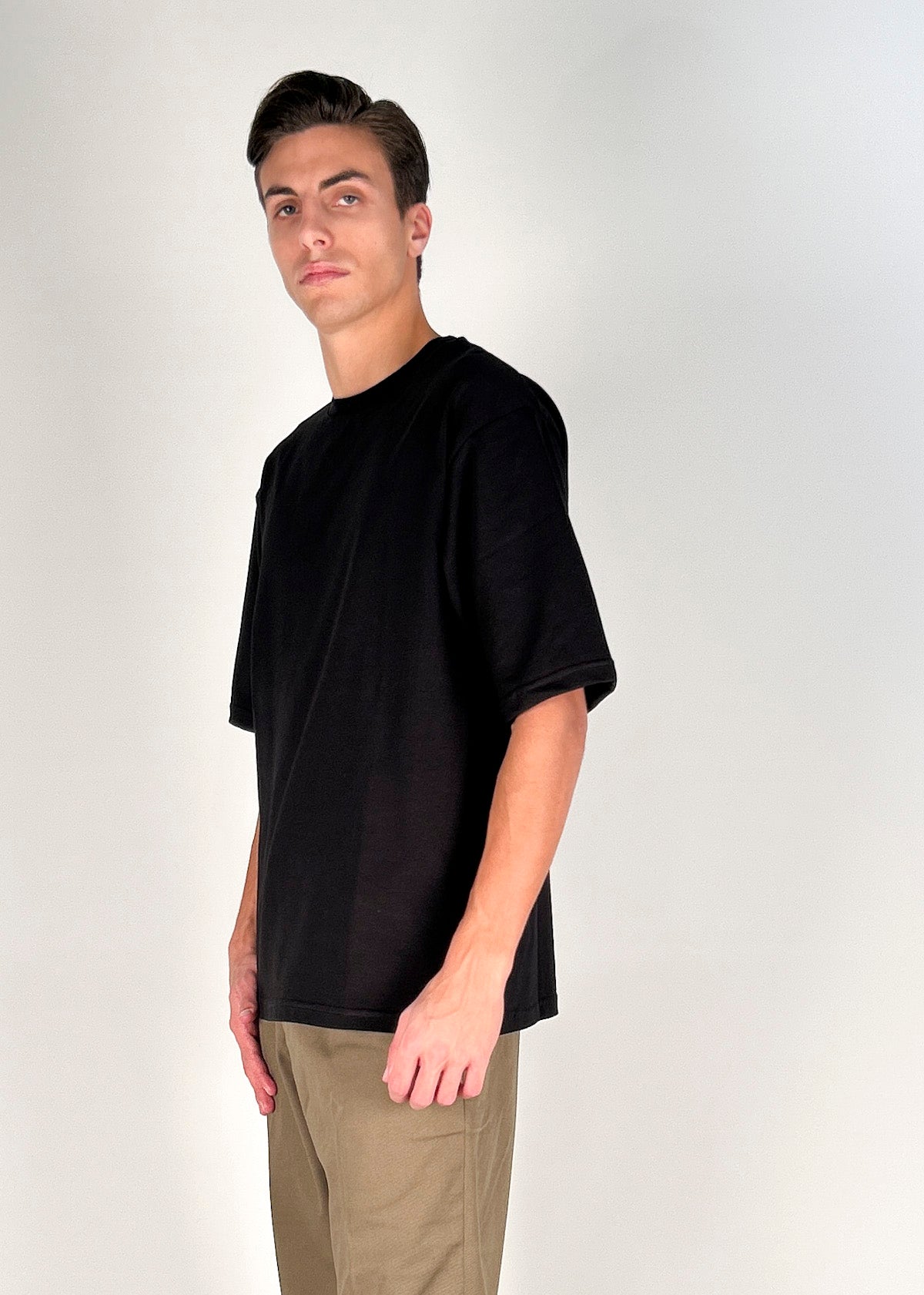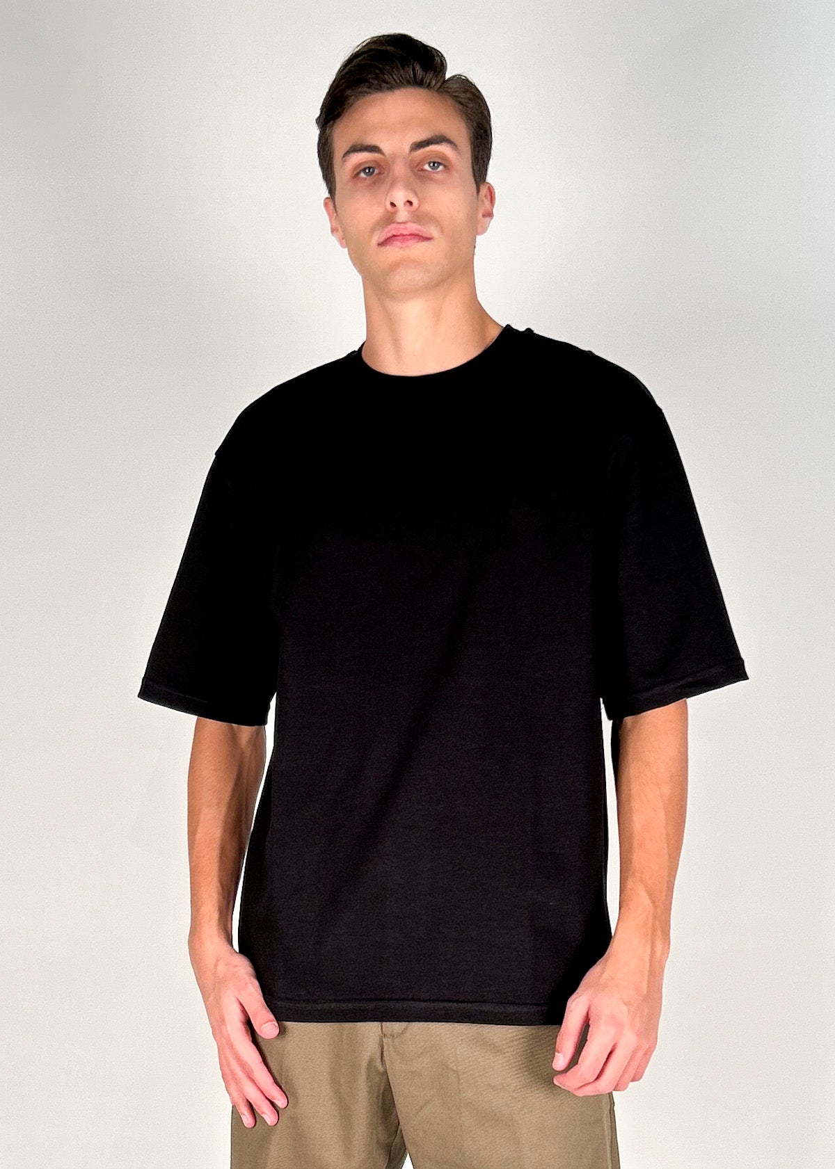 T-shirt manica corta girocollo in jersey di cotone tinto in capo. Vestibilita' over, disponibile dalla S alla XL. Il modello è alto 1.86m ed indossa la taglia M. Made in Italy.